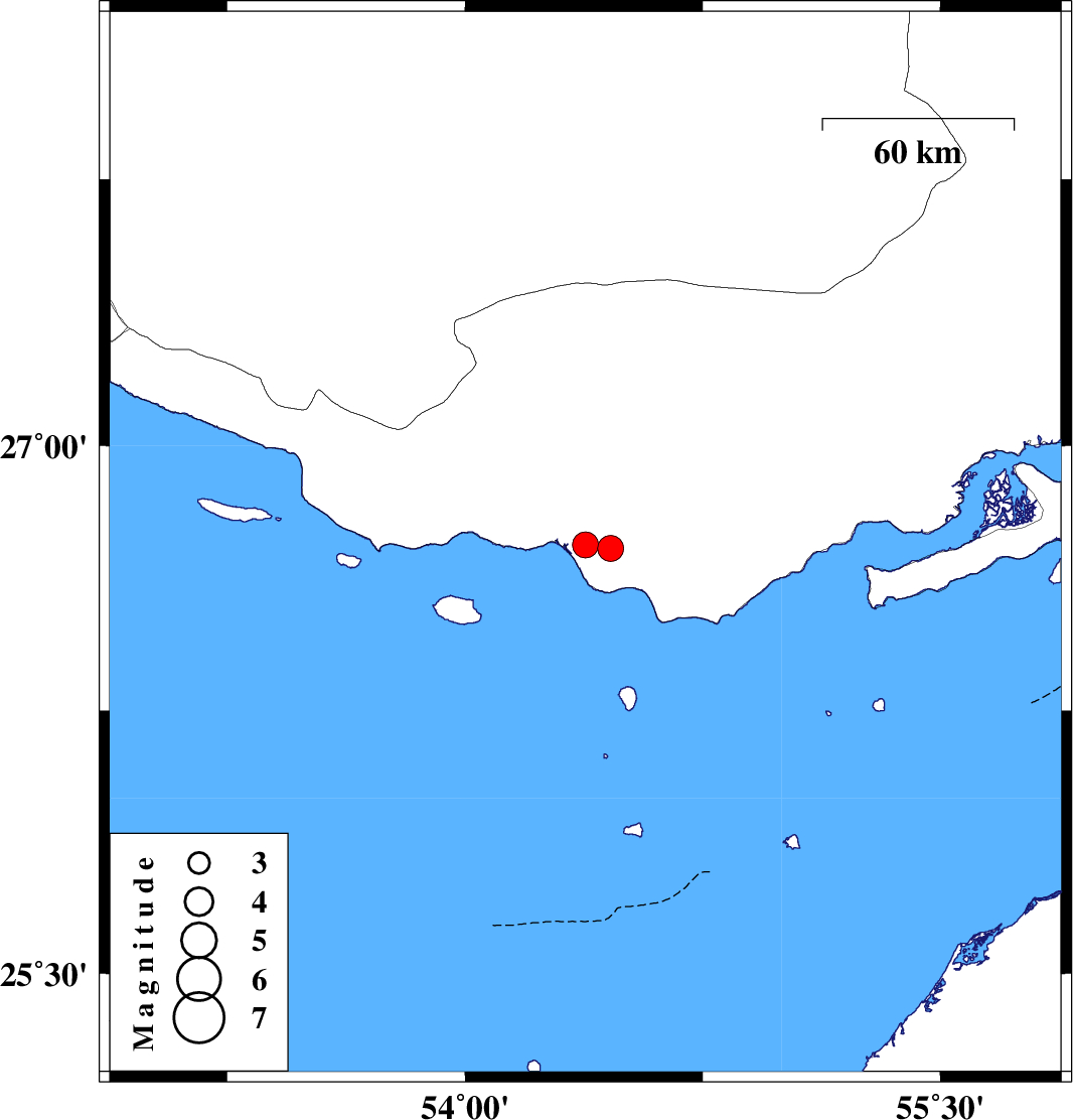 | 2011/02/18 | 17:13:26.5 | 20:43:26.5 | 26.71 | 54.46 | 14 | ML:3.6 | Hormozgan Province, 44 km North-West of Bandar-e lengeh | ||