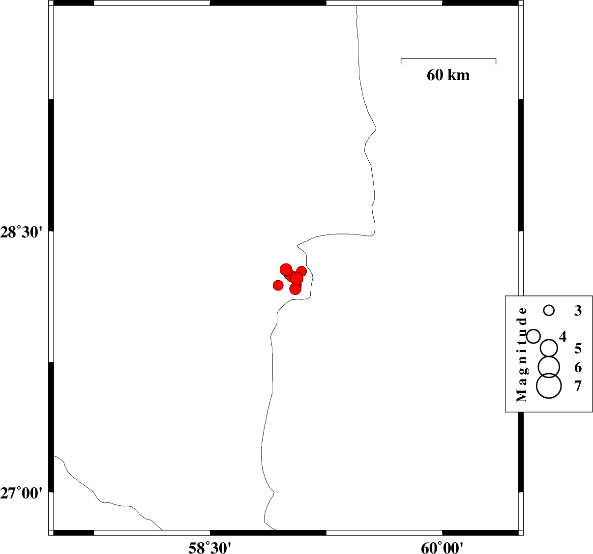 | 2011/02/12 | 00:09:56.4 | 03:39:56.4 | 28.25 | 59.01 | 18 | ML:2.8 | Kerman Province, 115 km South-East of Bam |