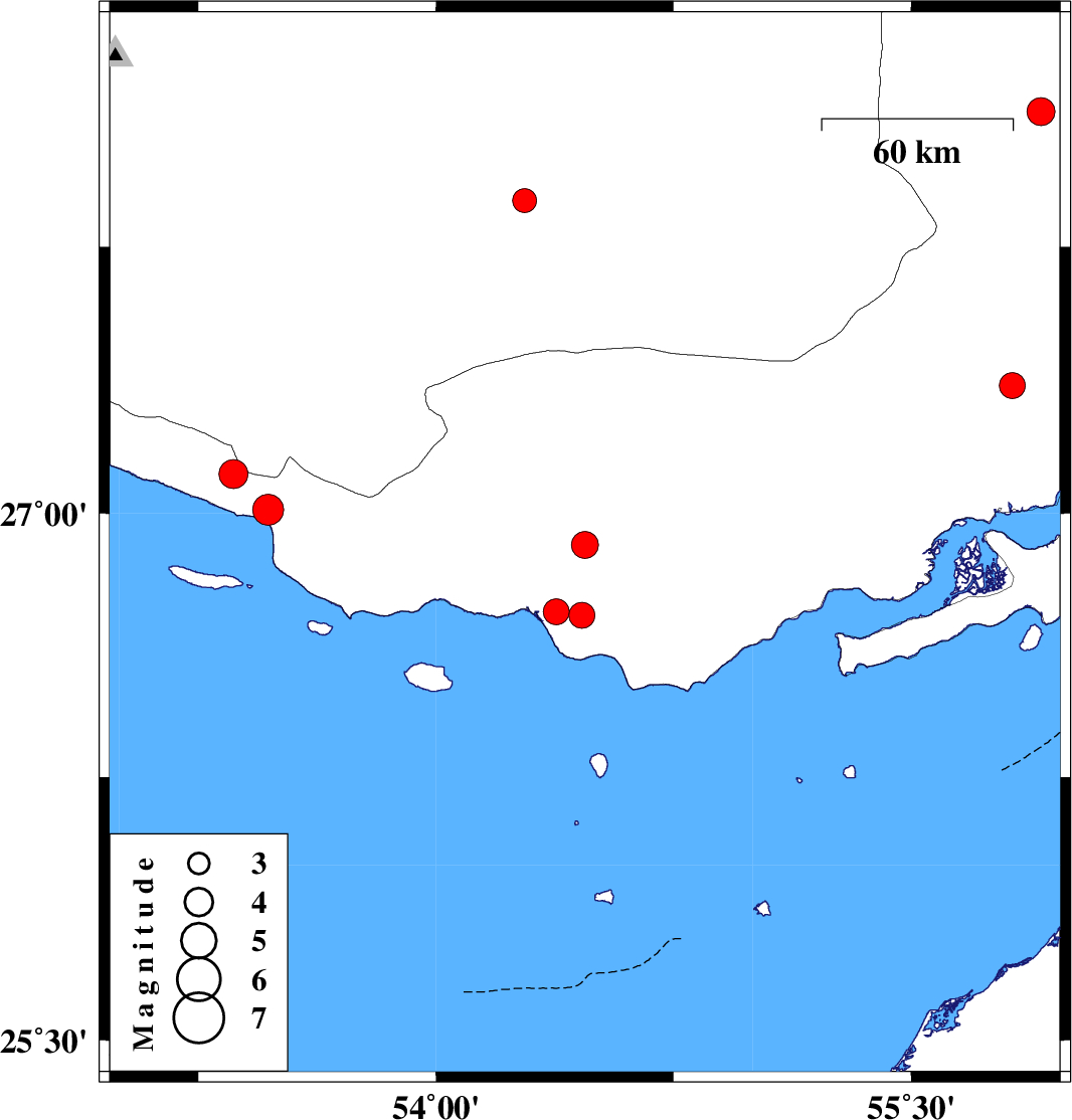 | 2011/02/18 | 17:13:26.5 | 20:43:26.5 | 26.71 | 54.46 | 14 | ML:3.6 | Hormozgan Province, 44 km North-West of Bandar-e lengeh | ||