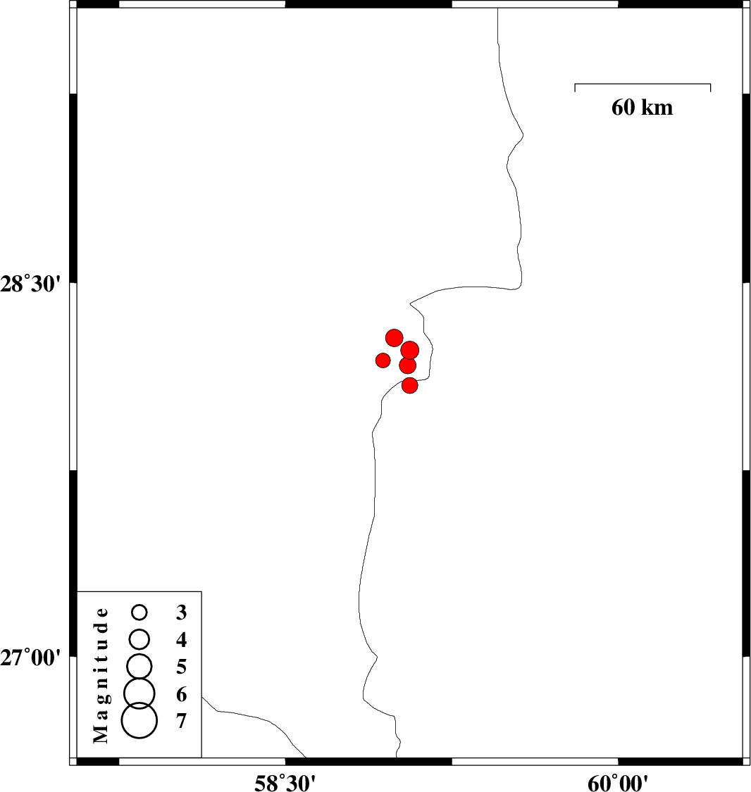 | 2011/02/19 | 01:07:27.5 | 04:37:27.5 | 28.28 | 58.99 | 14 | ML:3.5 | Kerman Province, 111 km South-East of Bam | ||