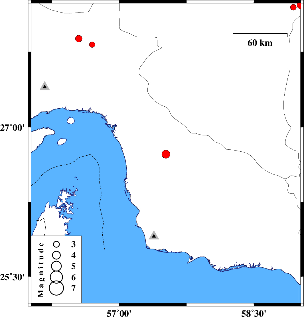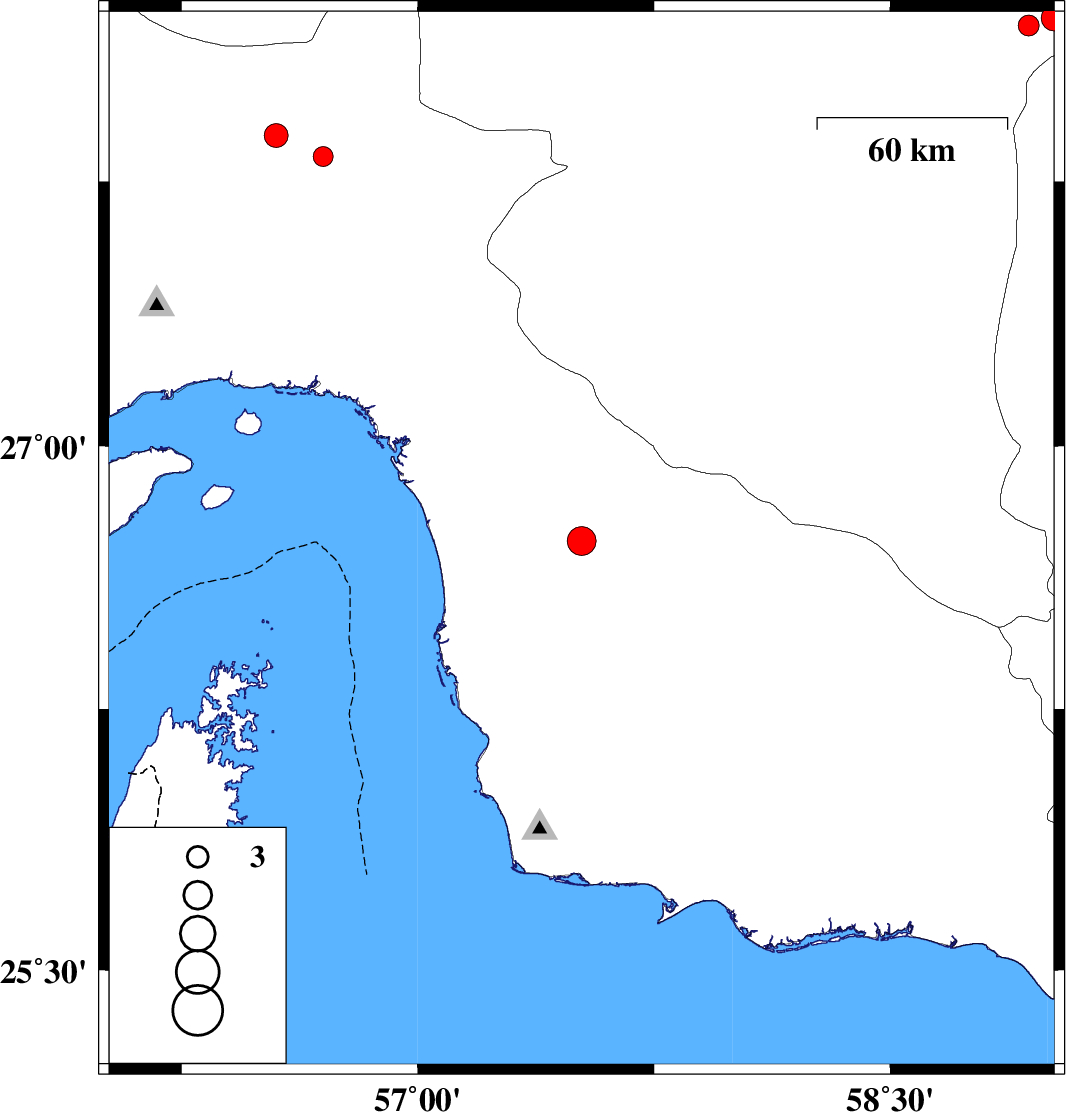 | 2011/02/16 | 01:32:42.4 | 05:02:42.4 | 28.19 | 58.94 | 14 | ML:3 | Kerman Province, 125 km North-East of Kahnuj | ||