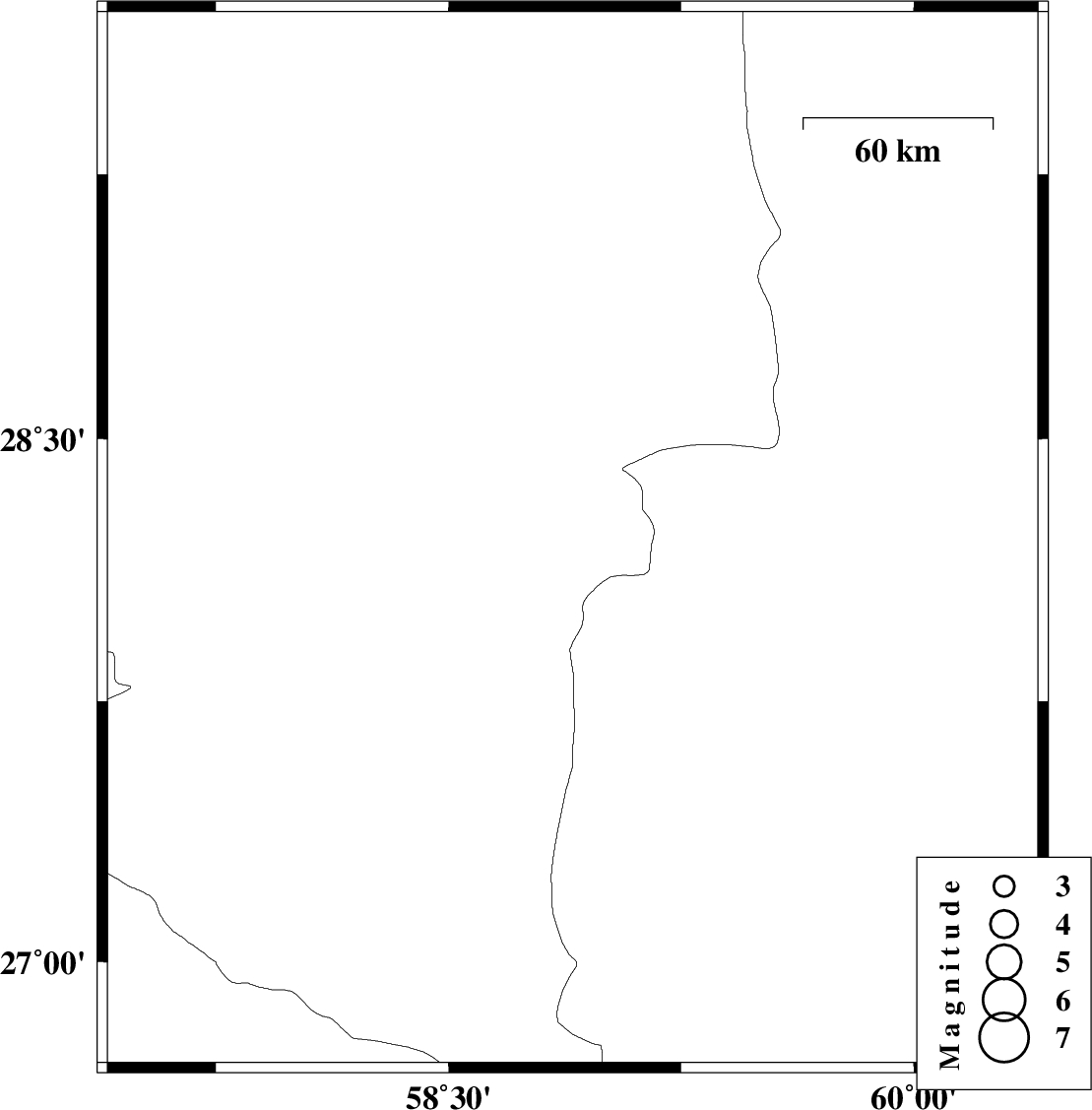 | 2011/02/19 | 01:07:27.5 | 04:37:27.5 | 28.28 | 58.99 | 14 | ML:3.5 | Kerman Province, 111 km South-East of Bam | ||