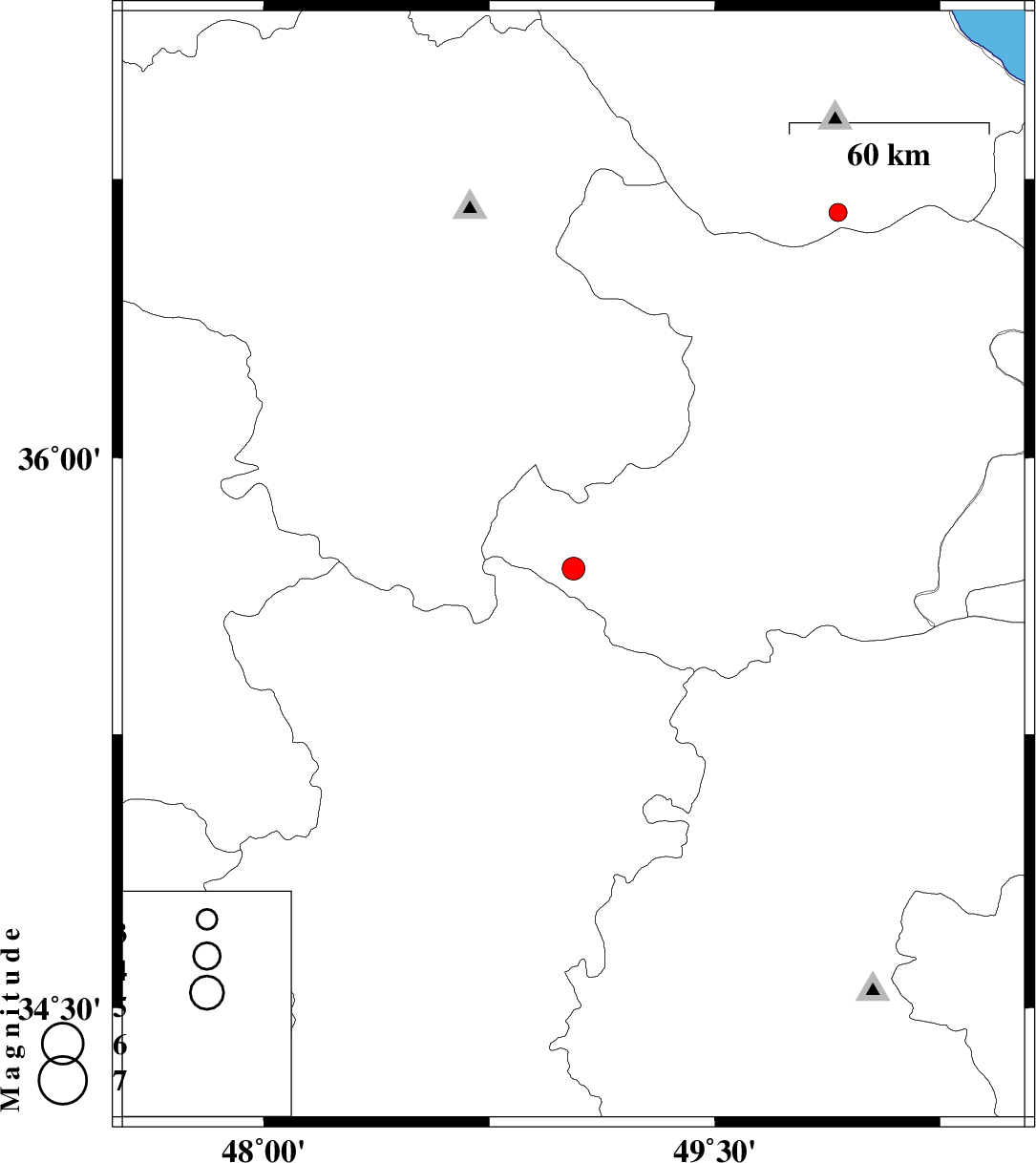 2011/02/22 | 22:01:45.6 | 01:31:45.6 | 36.66 | 49.91 | 14 | ML:2.7 | Gilan Province, 44 km North of Qazvin |