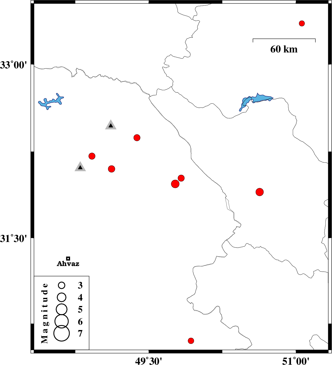 | 2011/02/24 | 06:16:51.2 | 09:46:51.2 | 32.21 | 48.92 | 26 | ML:3 | Khoozestan Province, 19 km North of Shushtar | ||