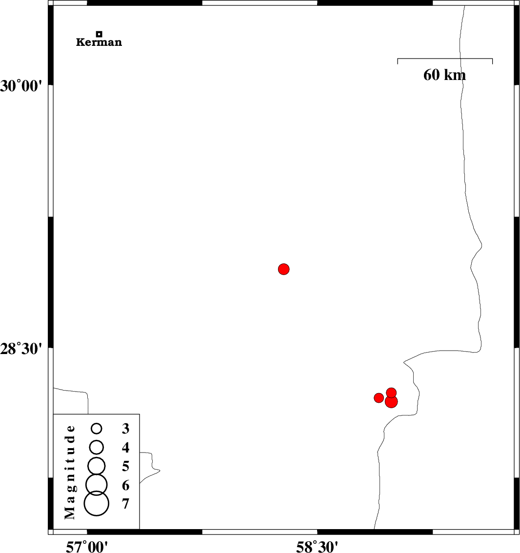 | 2011/02/28 | 21:30:07.3 | 01:00:07.3 | 28.24 | 58.98 | 14 | ML:3 | Kerman Province, 114 km South-East of Bam | ||
