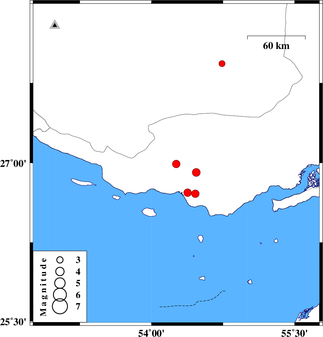 | 2011/02/18 | 17:13:26.5 | 20:43:26.5 | 26.71 | 54.46 | 14 | ML:3.6 | Hormozgan Province, 44 km North-West of Bandar-e lengeh | ||