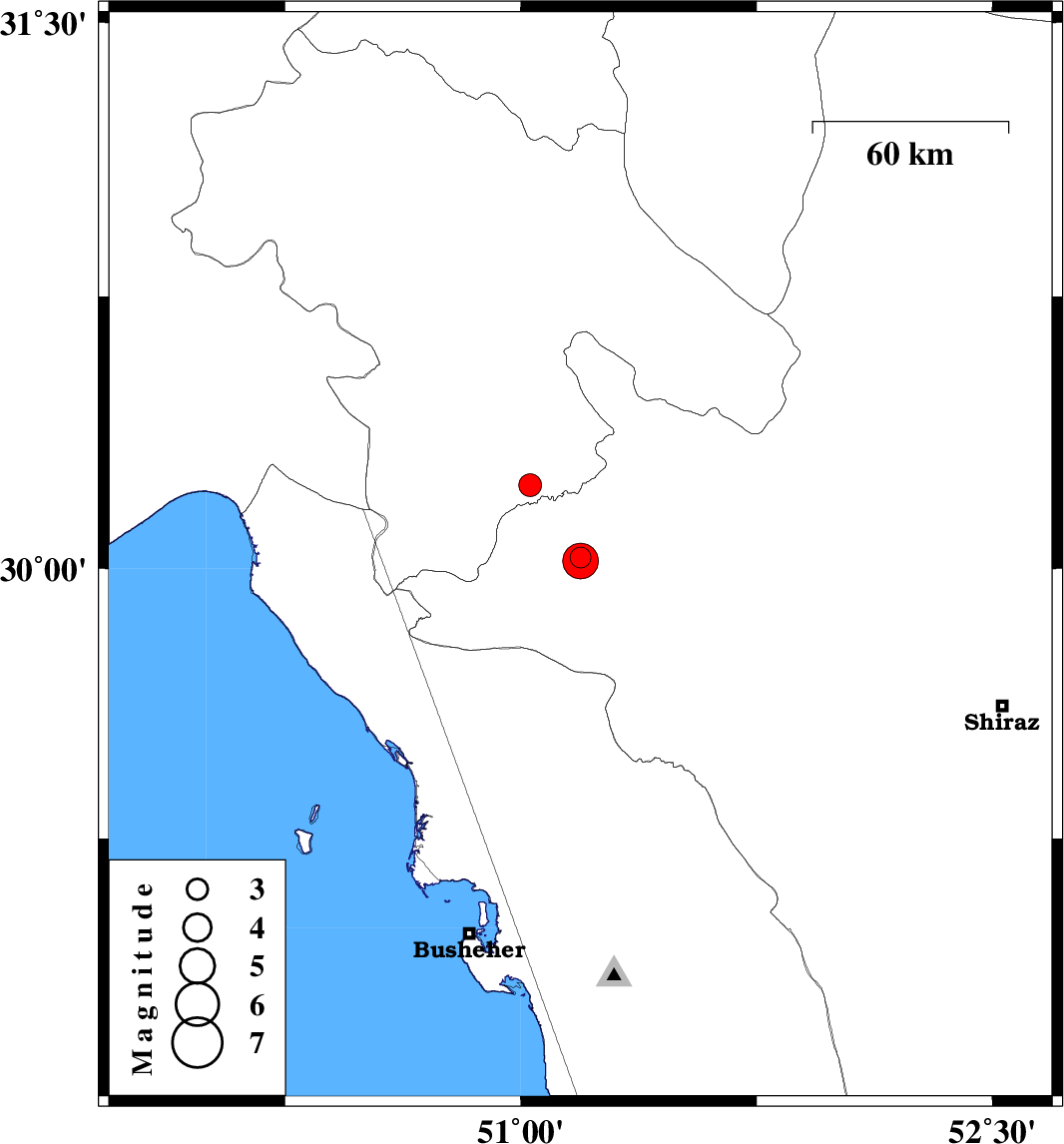 | 2011/03/08 | 00:43:54.1 | 04:13:54.1 | 30.03 | 51.19 | 14 | ML:2.9 | Fars Province, 33 km West of Nurabad | ||