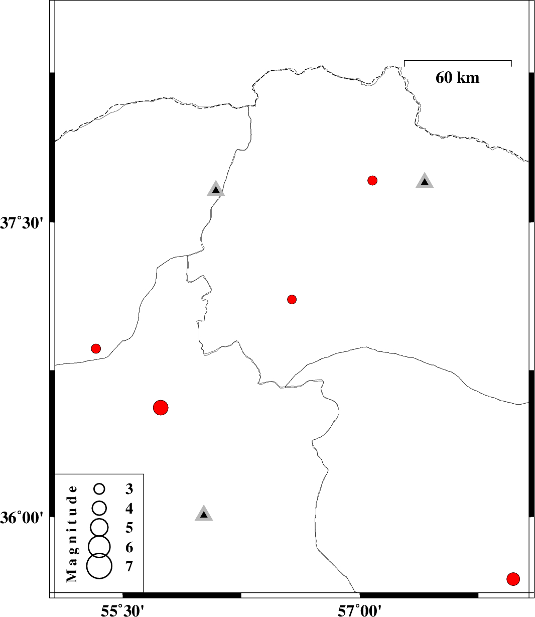| 2011/02/26 | 14:59:23.1 | 18:29:23.1 | 36.86 | 55.33 | 15 | ML:2.7 | Golestan Province, 24 km South-East of Ramian | ||