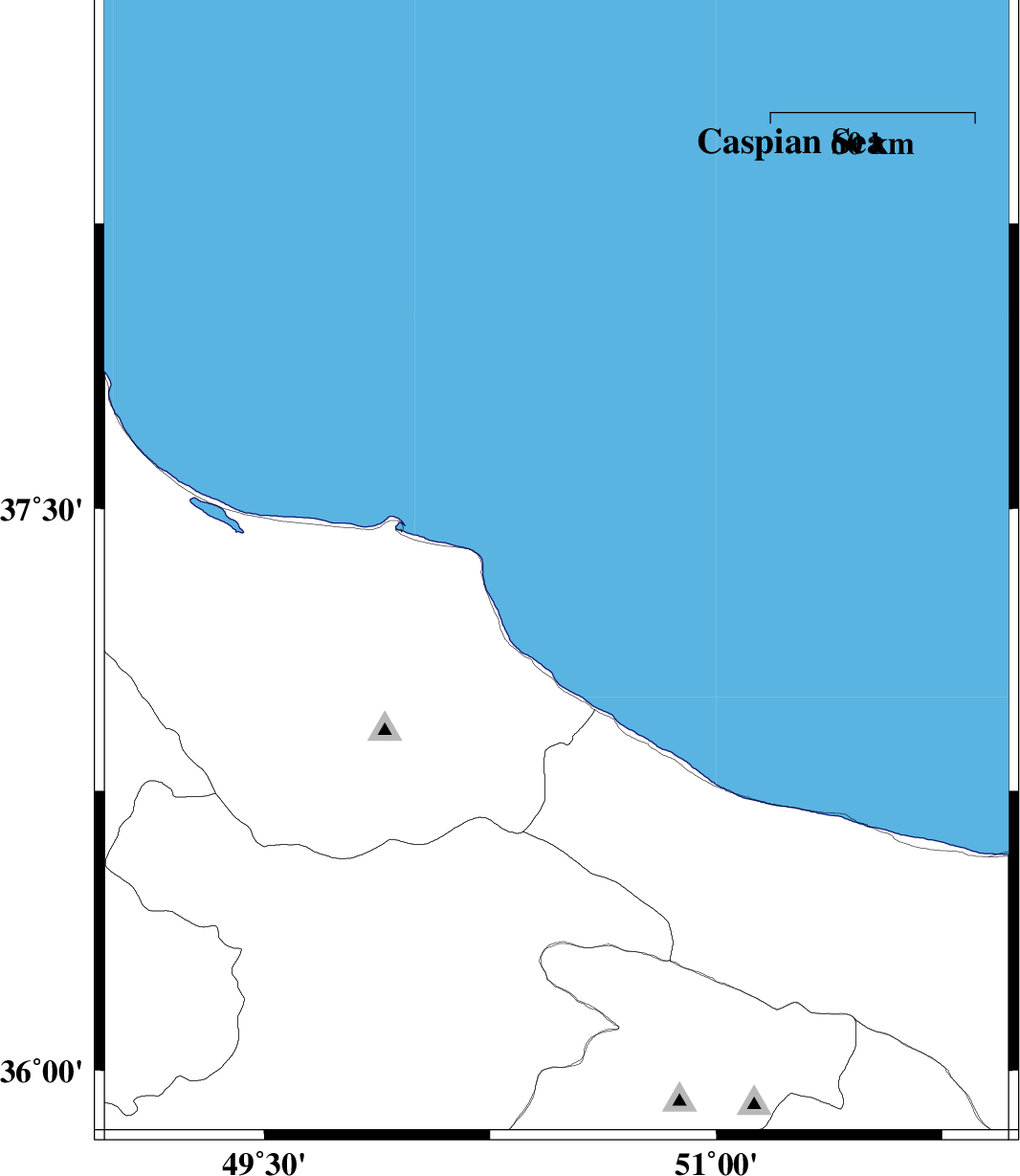 | 2011/03/11 | 16:38:28.6 | 20:08:28.6 | 37.34 | 50.47 | 38 | ML:3.1 | Caspian Sea, 28 km North-East of Rudsar | ||