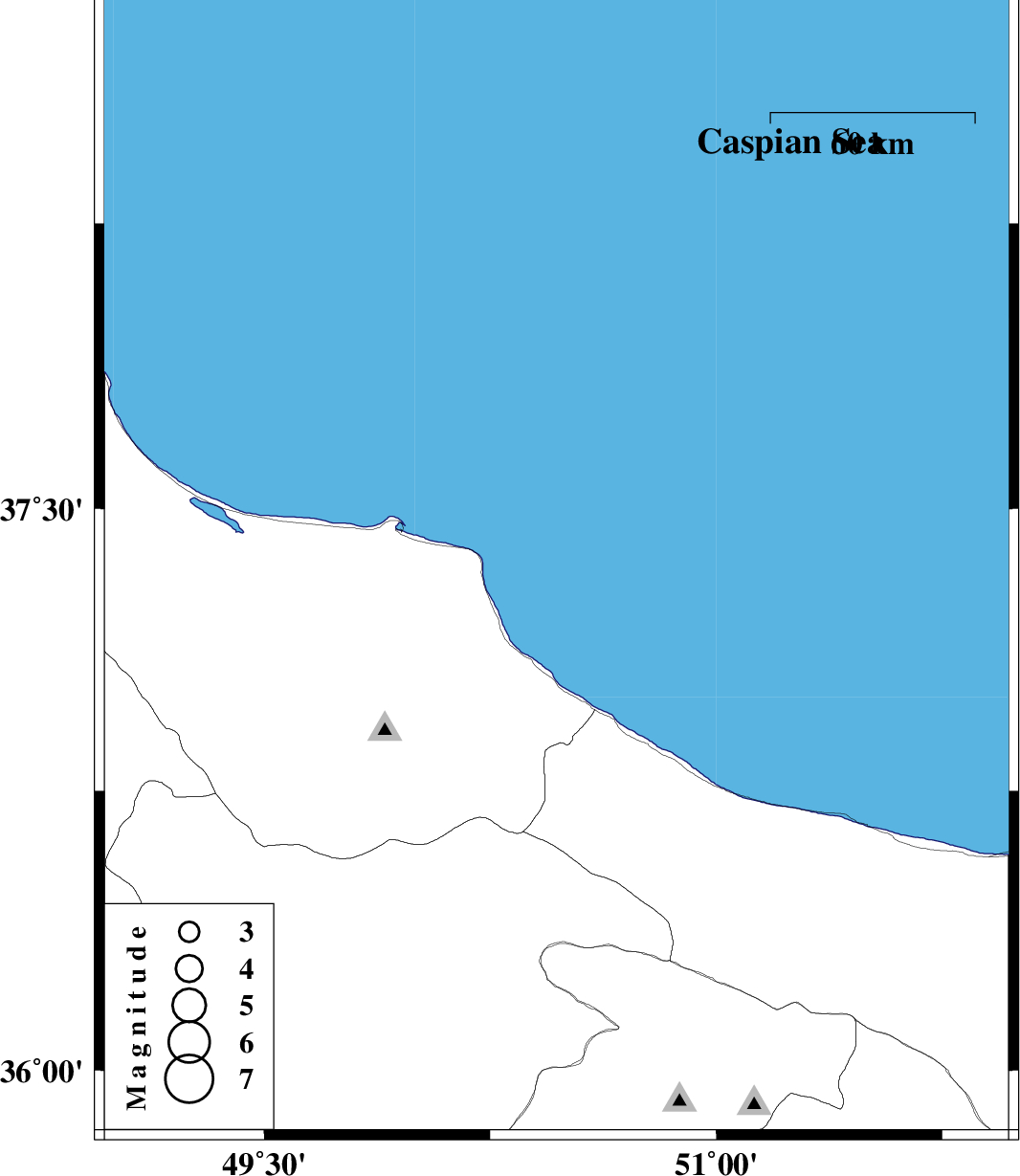 | 2011/03/11 | 16:38:28.6 | 20:08:28.6 | 37.34 | 50.47 | 38 | ML:3.1 | Caspian Sea, 28 km North-East of Rudsar |