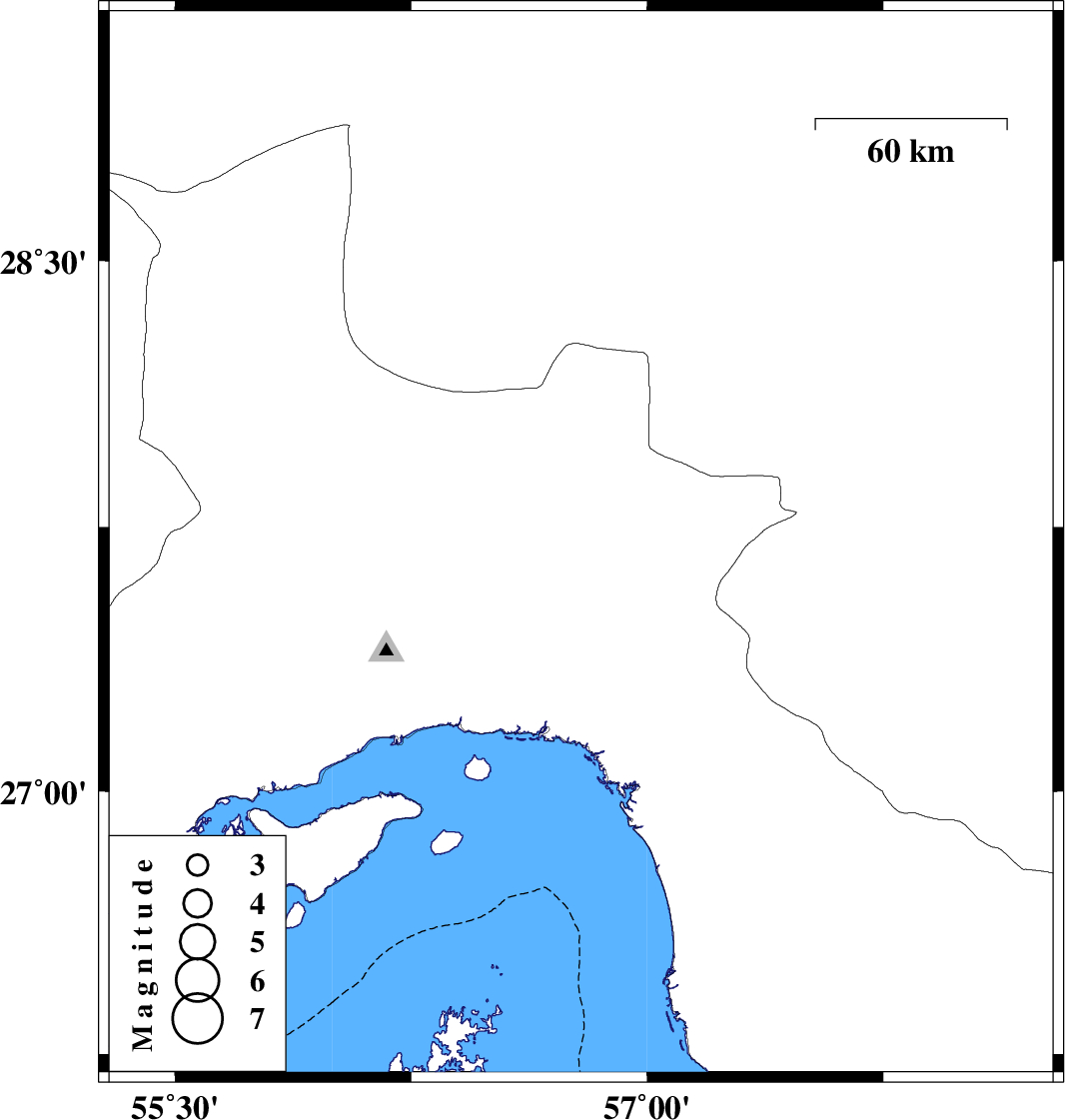 | 2011/03/14 | 07:55:09.8 | 11:25:09.8 | 27.7 | 56.79 | 25 | ML:4.8 | Hormozgan Province, 54 km North-West of Dehbarez |