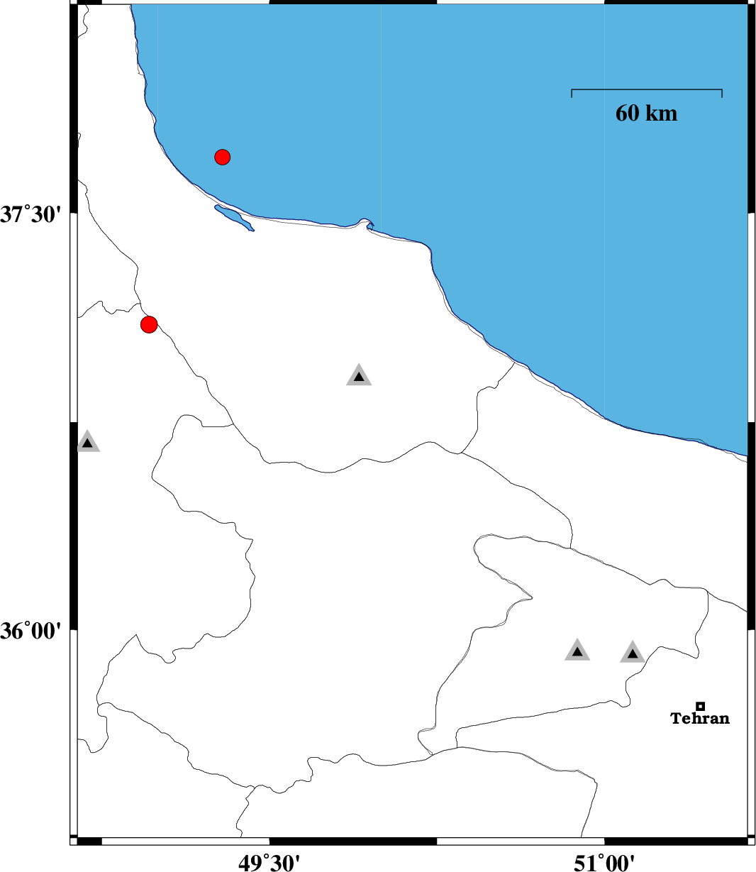 | 2011/03/11 | 16:38:28.6 | 20:08:28.6 | 37.34 | 50.47 | 38 | ML:3.1 | Caspian Sea, 28 km North-East of Rudsar |