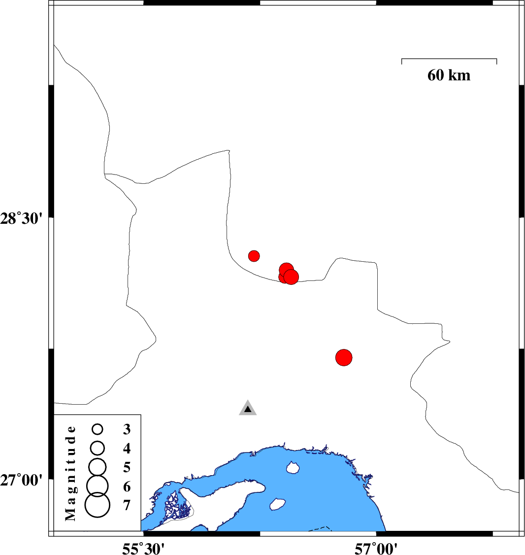 2011/03/14 07:55:09.8 11:25:09.8 27.756.7925 ML:4.8 Hormozgan Province, 54 km North-West of Dehbarez