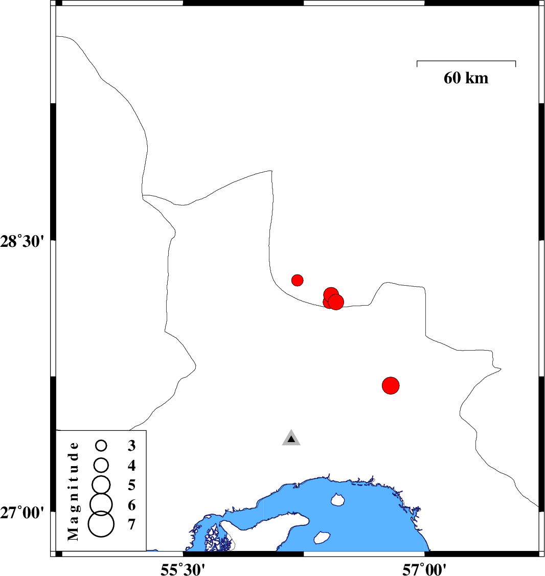 2011/03/14 07:55:09.8 11:25:09.8 27.756.7925 ML:4.8 Hormozgan Province, 54 km North-West of Dehbarez