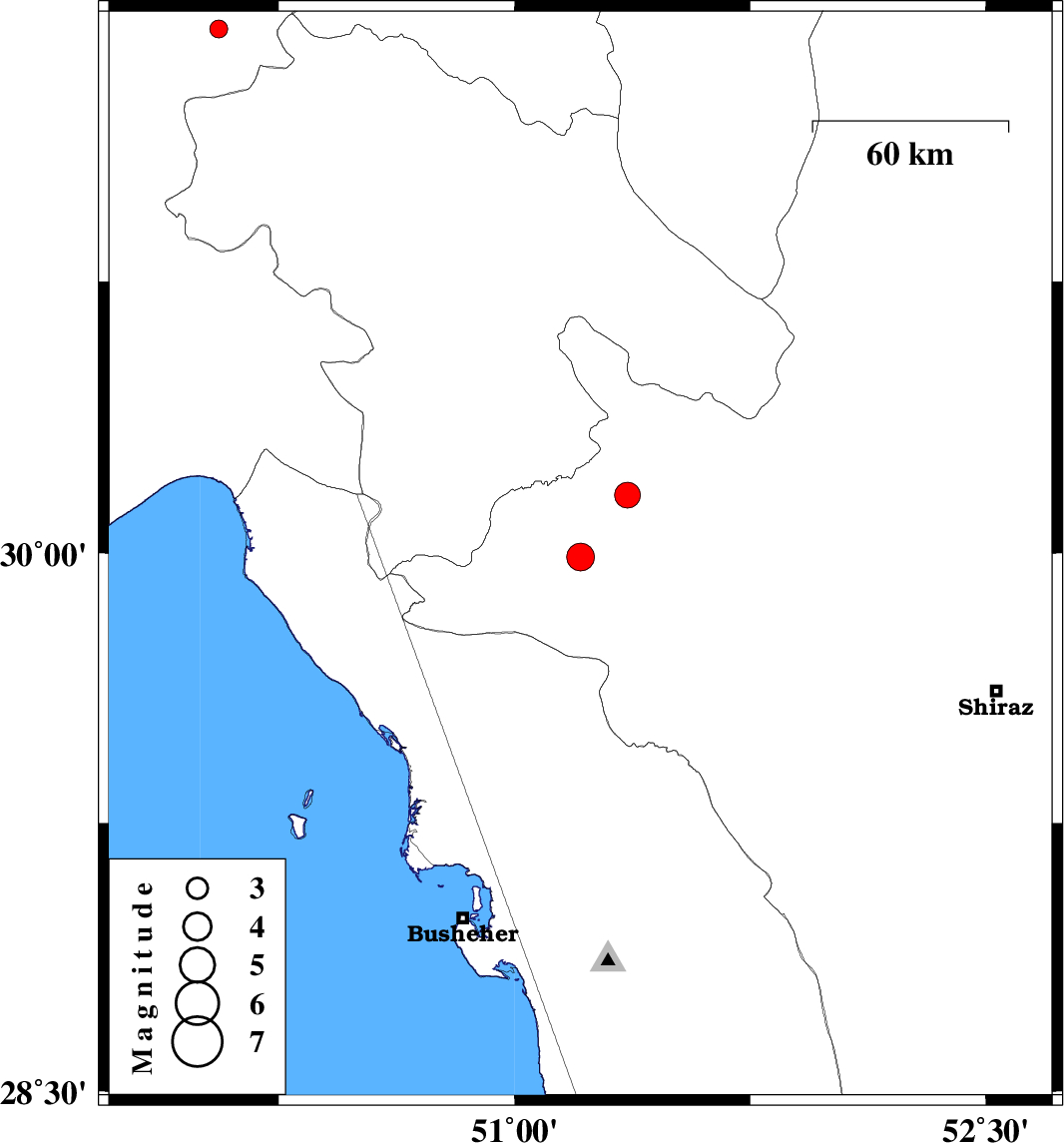 | 2011/03/14 | 09:12:31.0 | 12:42:31.0 | 30.16 | 51.36 | 15 | ML:3.6 | Fars Province, 16 km West of Nurabad |