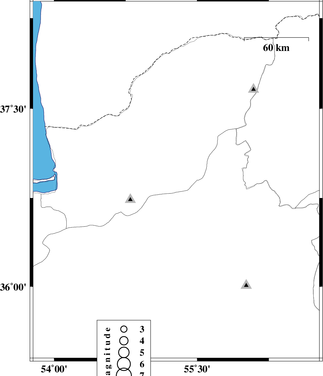 | 2011/03/22 | 03:46:56.3 | 08:16:56.3 | 36.89 | 55.28 | 14 | ML:2.5 | Golestan Province, 18 km South-East of Ramian |