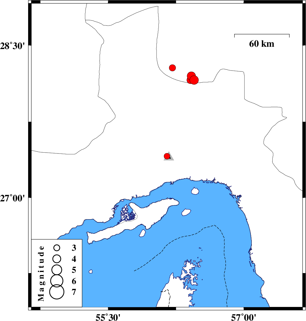 | 2011/03/22 | 23:56:26.7 | 04:26:26.7 | 27.41 | 56.15 | 16 | ML:3 | Hormozgan Province, 29 km North-West of Bandar-e abbas | ||