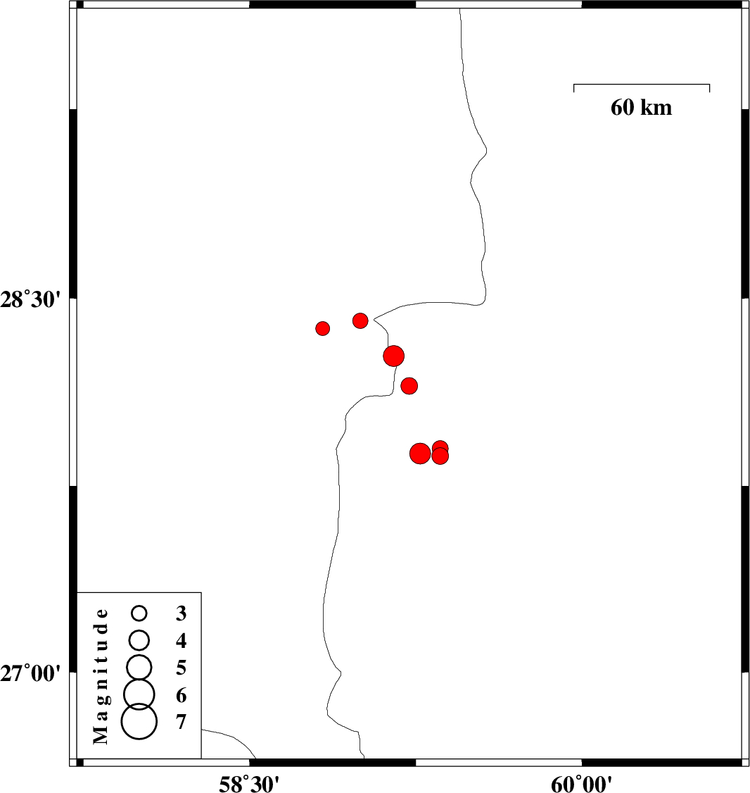 | 2011/03/21 | 06:02:22.5 | 09:32:22.5 | 27.88 | 59.27 | 18 | ML:4.2 | Sistan va Baloochestan Province, 155 km East of Kahnuj | ||
