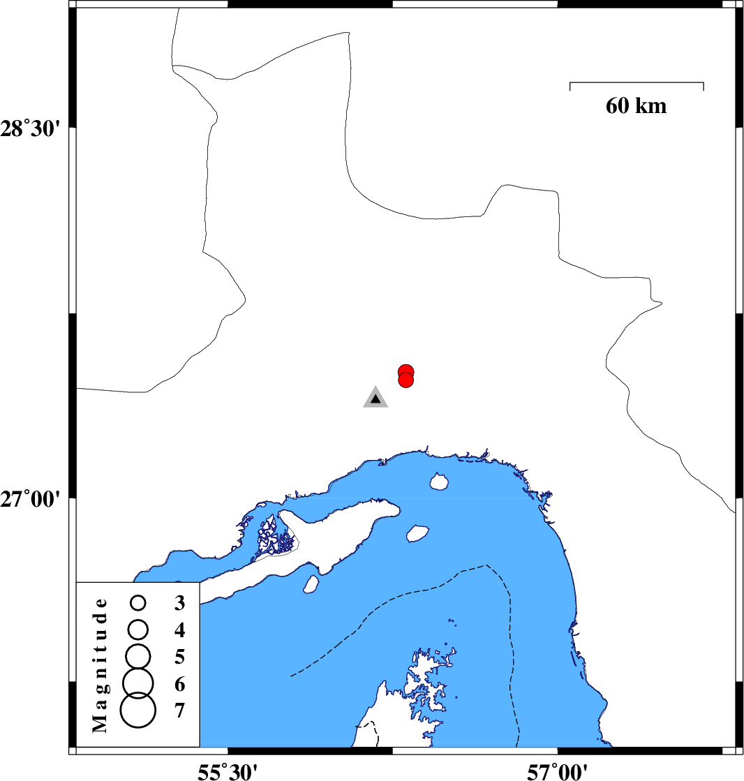 | 2011/03/30 | 23:07:30.2 | 03:37:30.2 | 27.48 | 56.31 | 14 | ML:3.1 | Hormozgan Province, 33 km North of Bandar-e abbas | ||