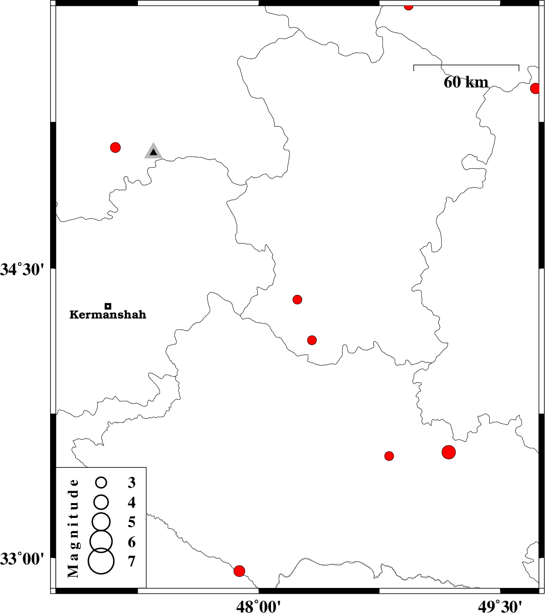 | 2011/03/23 | 08:34:12.6 | 13:04:12.6 | 35.12 | 47.11 | 9 | ML:2.8 | Kordestan Province, 24 km South-East of Sanandaj | ||