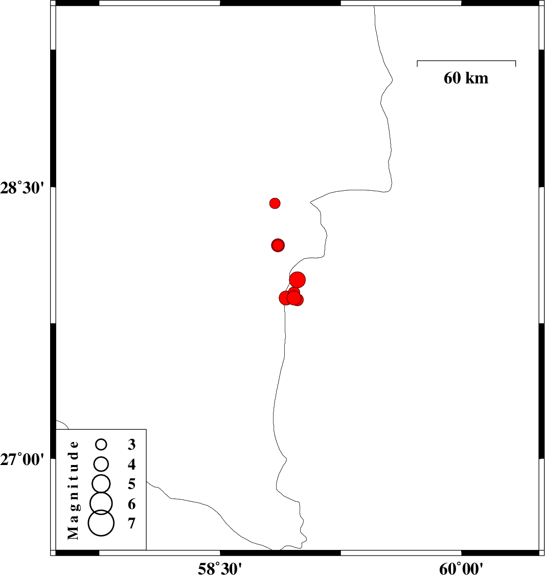 | 2011/04/09 | 19:55:57.6 | 00:25:57.6 | 28.41 | 58.84 | 14 | ML:2.9 | Kerman Province, 92 km South-East of Bam |