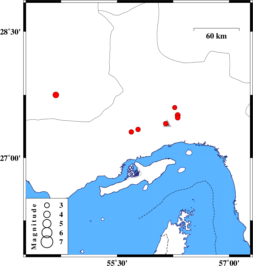 | 2011/03/30 | 23:07:30.2 | 03:37:30.2 | 27.48 | 56.31 | 14 | ML:3.1 | Hormozgan Province, 33 km North of Bandar-e abbas | ||