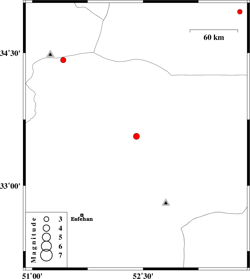 | 2011/04/21 | 21:23:40.9 | 01:53:40.9 | 33.56 | 52.41 | 15 | ML:3.8 | Esfahan Province, 20 km North of Ardestan | ||