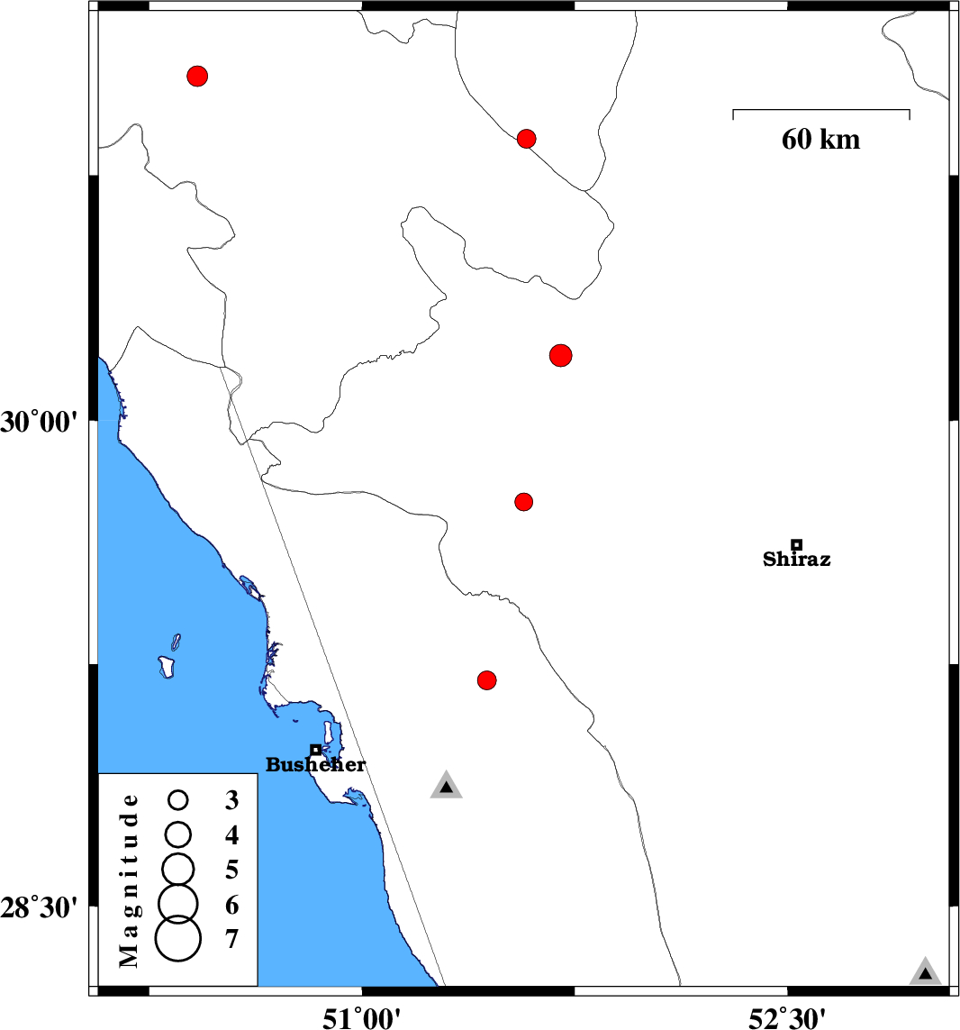 | 2011/04/23 | 03:31:06.0 | 08:01:06.0 | 29.75 | 51.57 | 37 | ML:2.8 | Fars Province, 17 km North of Kazerun | ||
