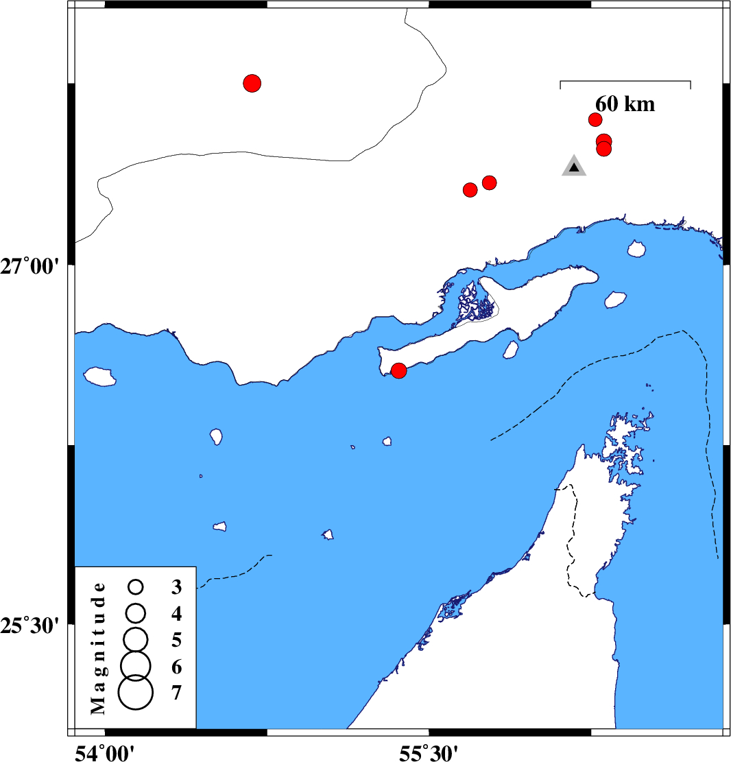 | 2011/04/01 | 02:03:17.5 | 06:33:17.5 | 27.31 | 55.69 | 14 | ML:3 | Hormozgan Province, 61 km North-West of Bandar-e abbas | ||