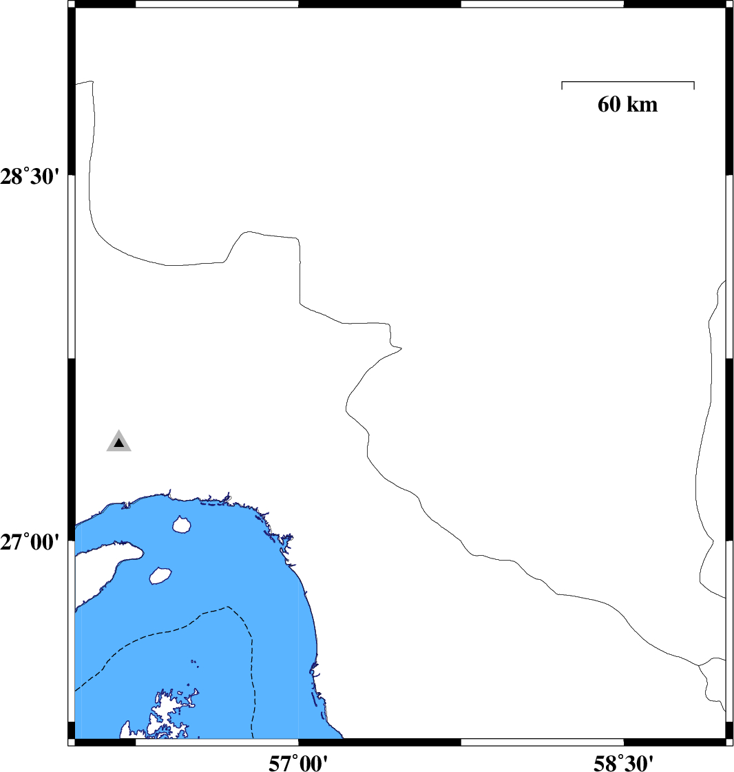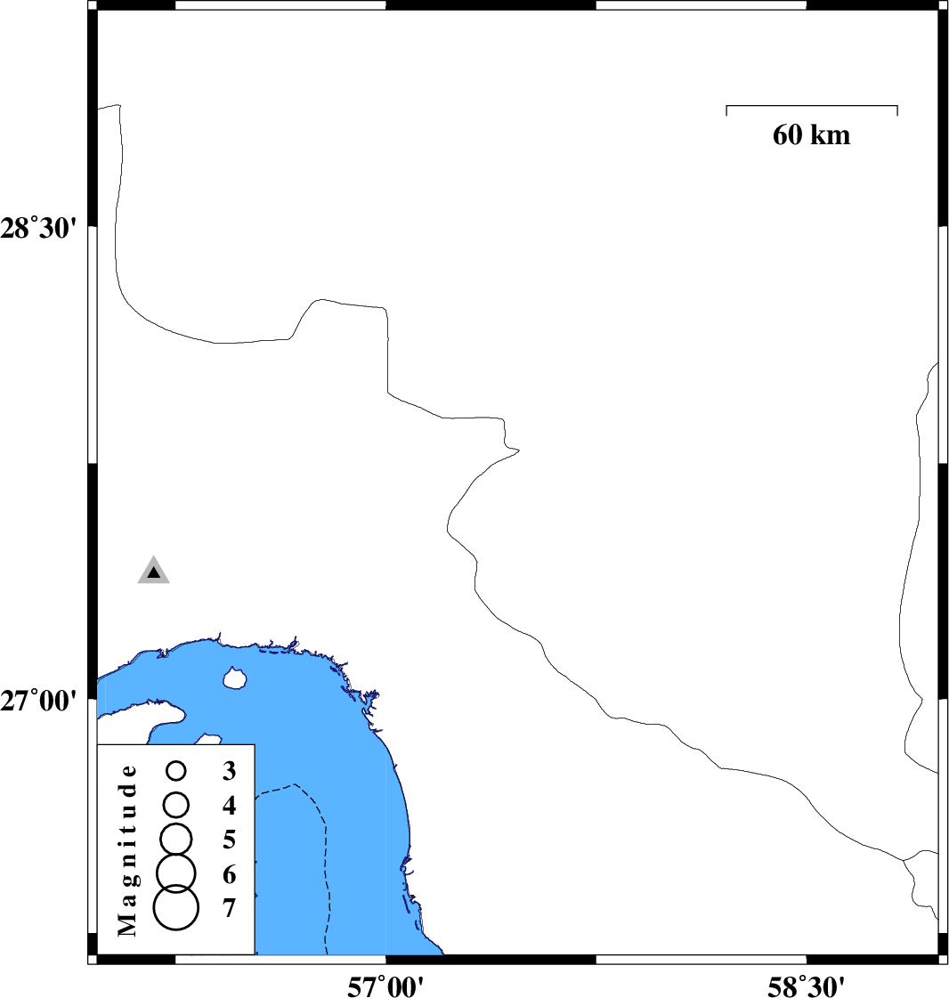 | 2011/04/26 | 20:11:02.6 | 00:41:02.6 | 27.68 | 57.47 | 35 | ML:2.8 | Kerman Province, 30 km North of Manujan |
