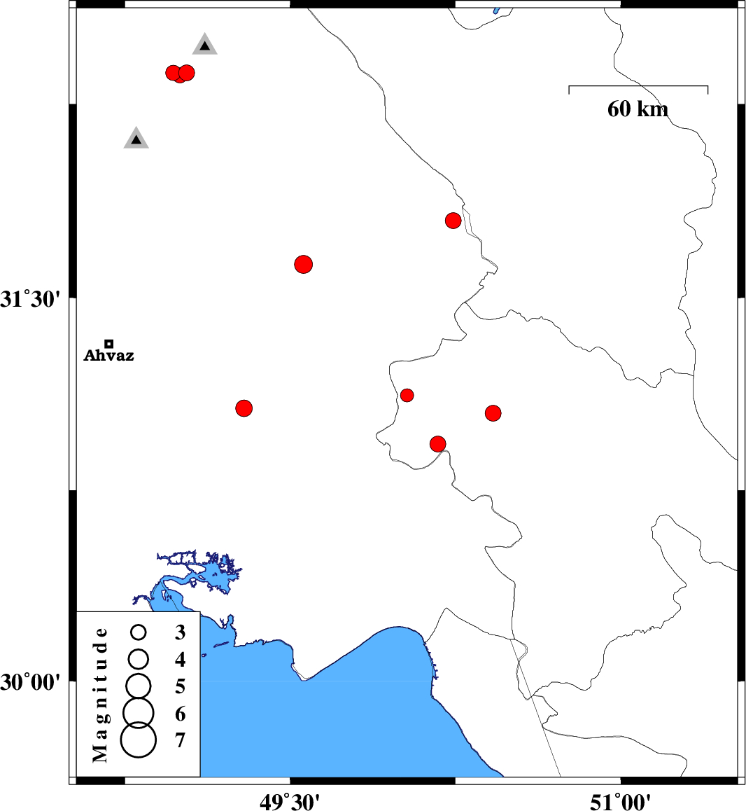 | 2011/04/19 | 15:43:13.6 | 20:13:13.6 | 31.63 | 49.56 | 14 | ML:3.7 | Khoozestan Province, 39 km North of Ramhormoz | ||