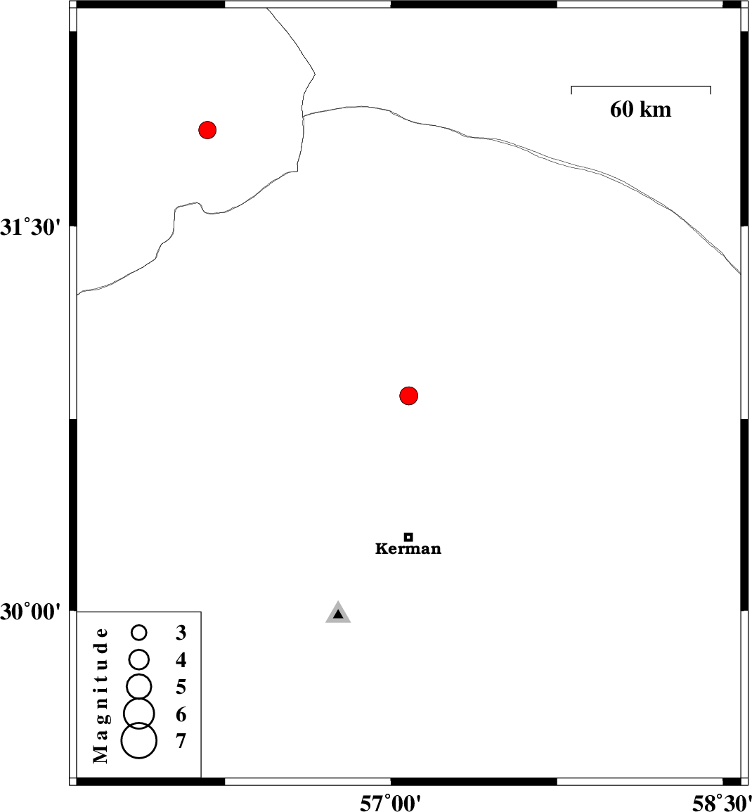| 2011/04/30 | 08:55:13.2 | 13:25:13.2 | 30.84 | 57.08 | 14 | ML:3.7 | Kerman Province, 49 km East of Zarand | ||