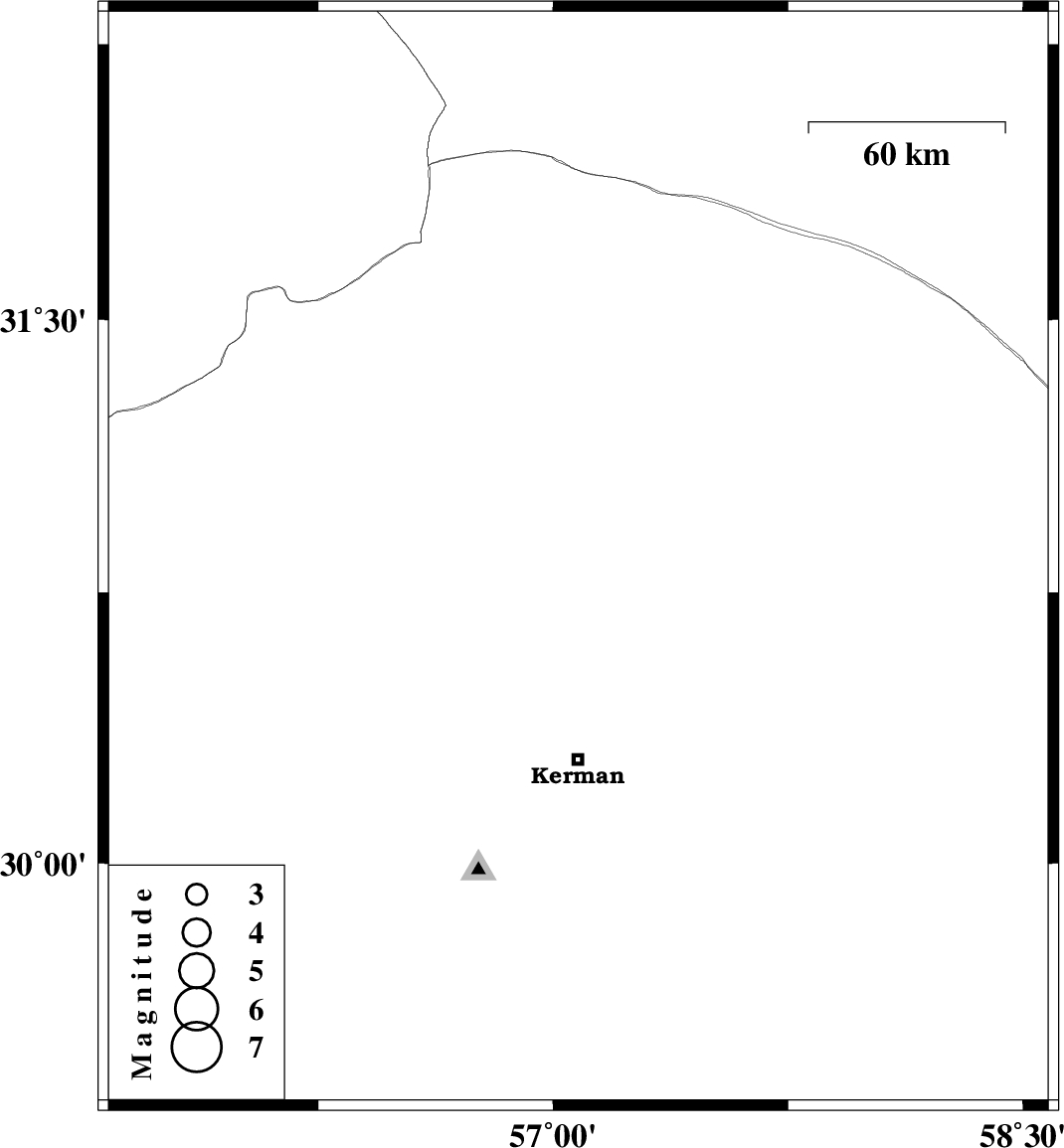 | 2011/04/30 | 08:55:13.2 | 13:25:13.2 | 30.84 | 57.08 | 14 | ML:3.7 | Kerman Province, 49 km East of Zarand |