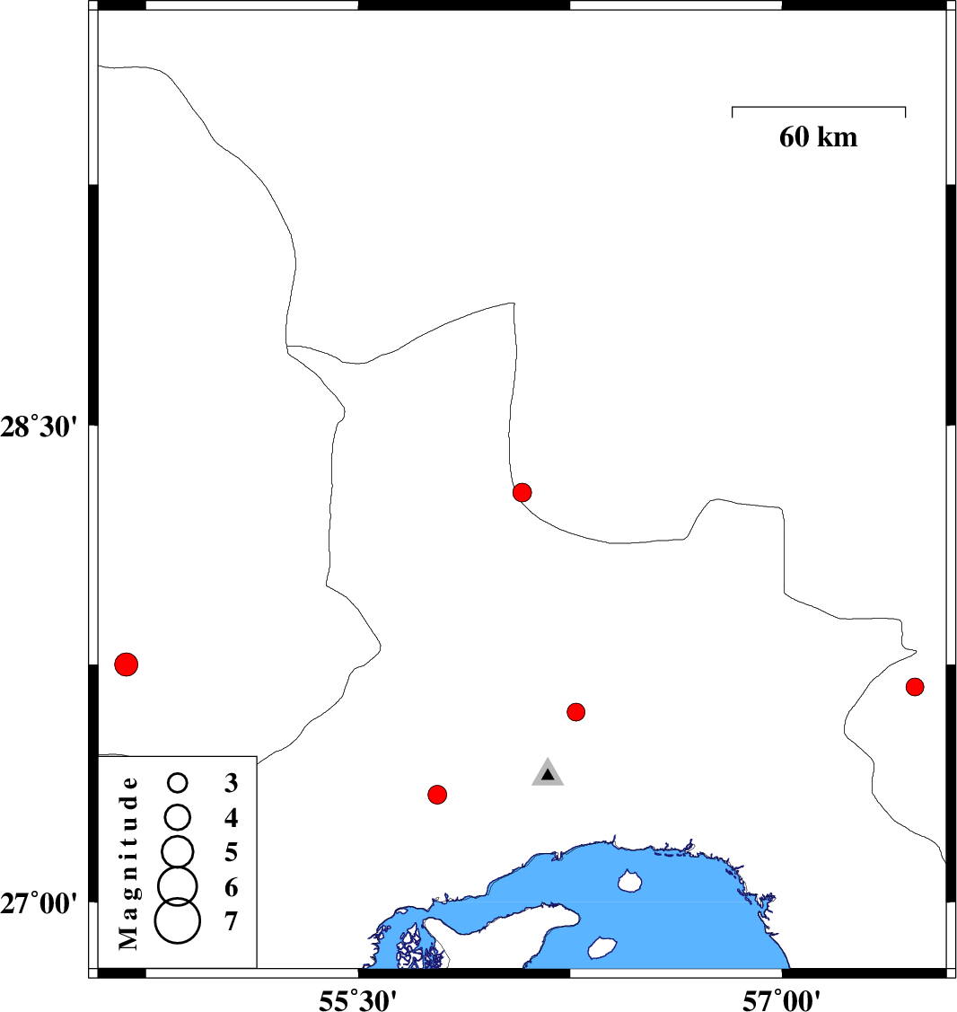 | 2011/04/05 | 22:57:42.9 | 03:27:42.9 | 27.6 | 56.27 | 14 | ML:2.8 | Hormozgan Province, 46 km North of Bandar-e abbas |