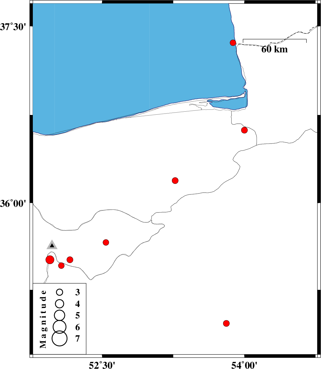 | 2011/05/06 | 00:49:20.2 | 05:19:20.2 | 36.19 | 53.27 | 15 | ML:3 | Mazandaran Province, 21 km East of Pol-E-Sefid | ||