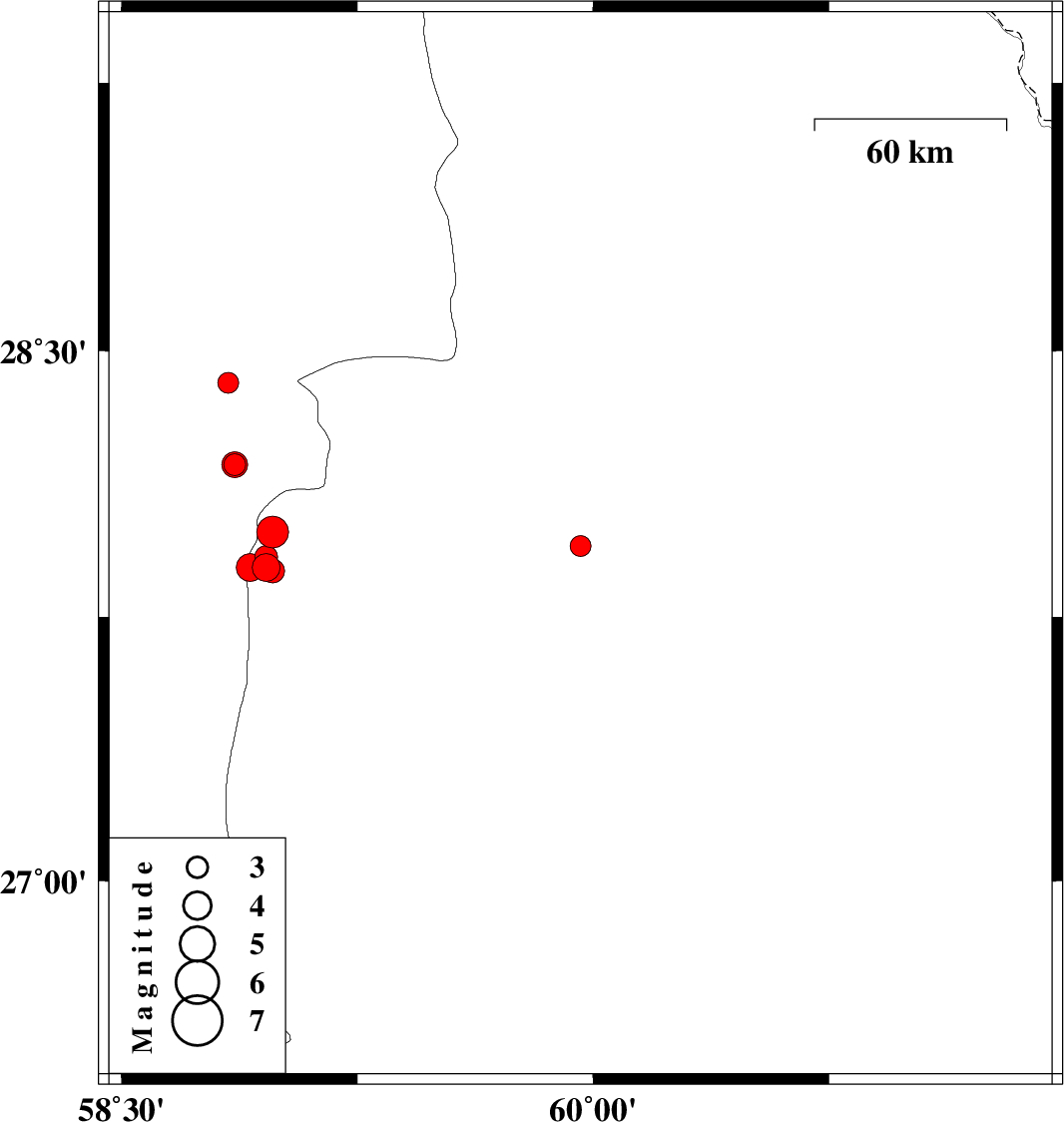 | 2011/05/06 | 15:28:11.1 | 19:58:11.1 | 27.95 | 59.96 | 17 | ML:3 | Sistan va Baloochestan Province, 109 km North-West of Iranshahr | ||