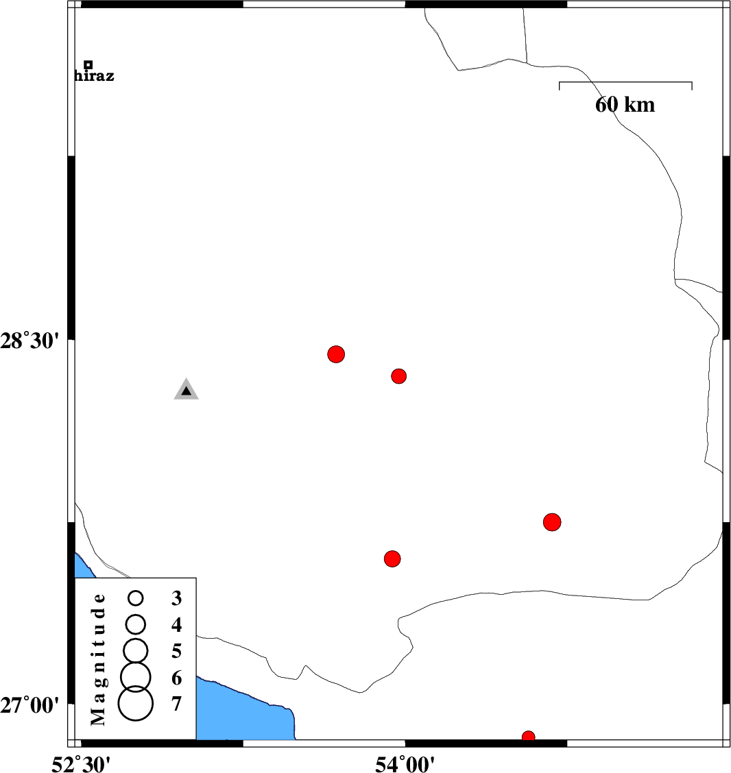 | 2011/05/07 | 09:44:51.4 | 14:14:51.4 | 28.35 | 53.97 | 46 | ML:3.1 | Fars Province, 44 km South-East of Jahrom | ||