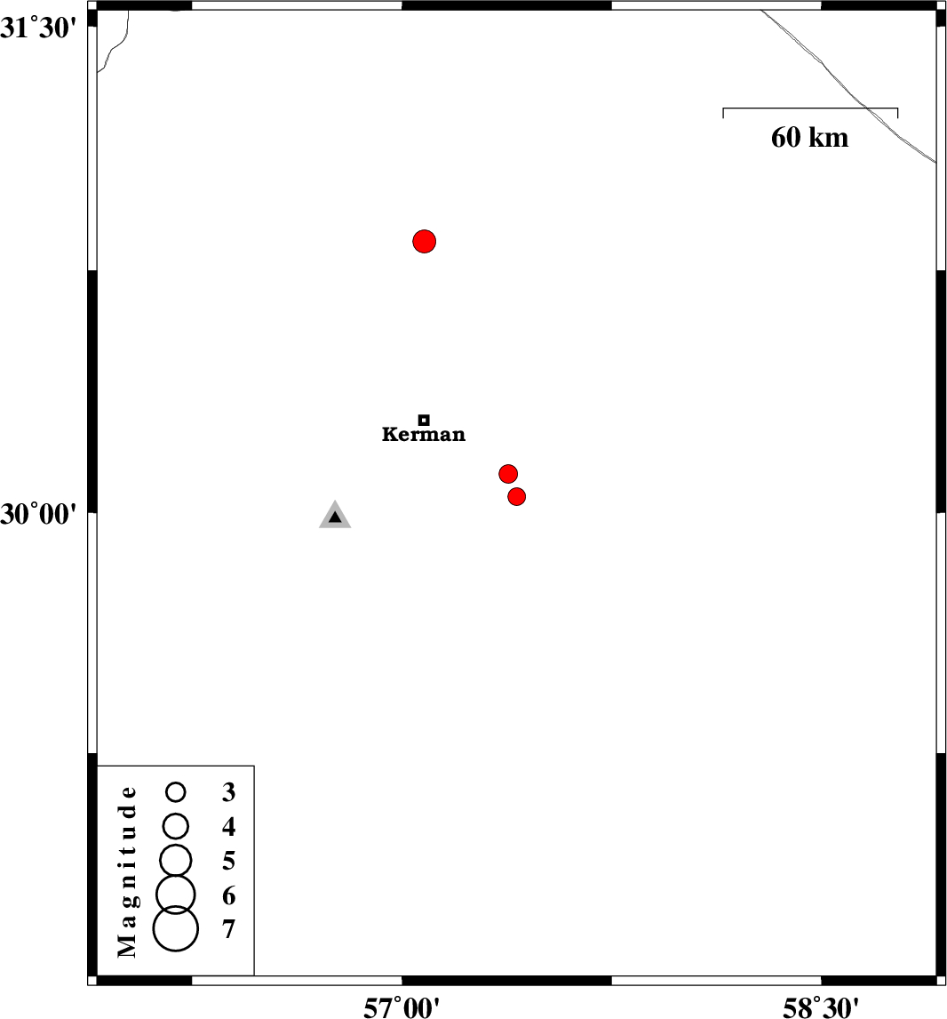 | 2011/05/11 | 20:14:48.5 | 00:44:48.5 | 30.12 | 57.38 | 6 | ML:3 | Kerman Province, 35 km South-East of Kerman | ||