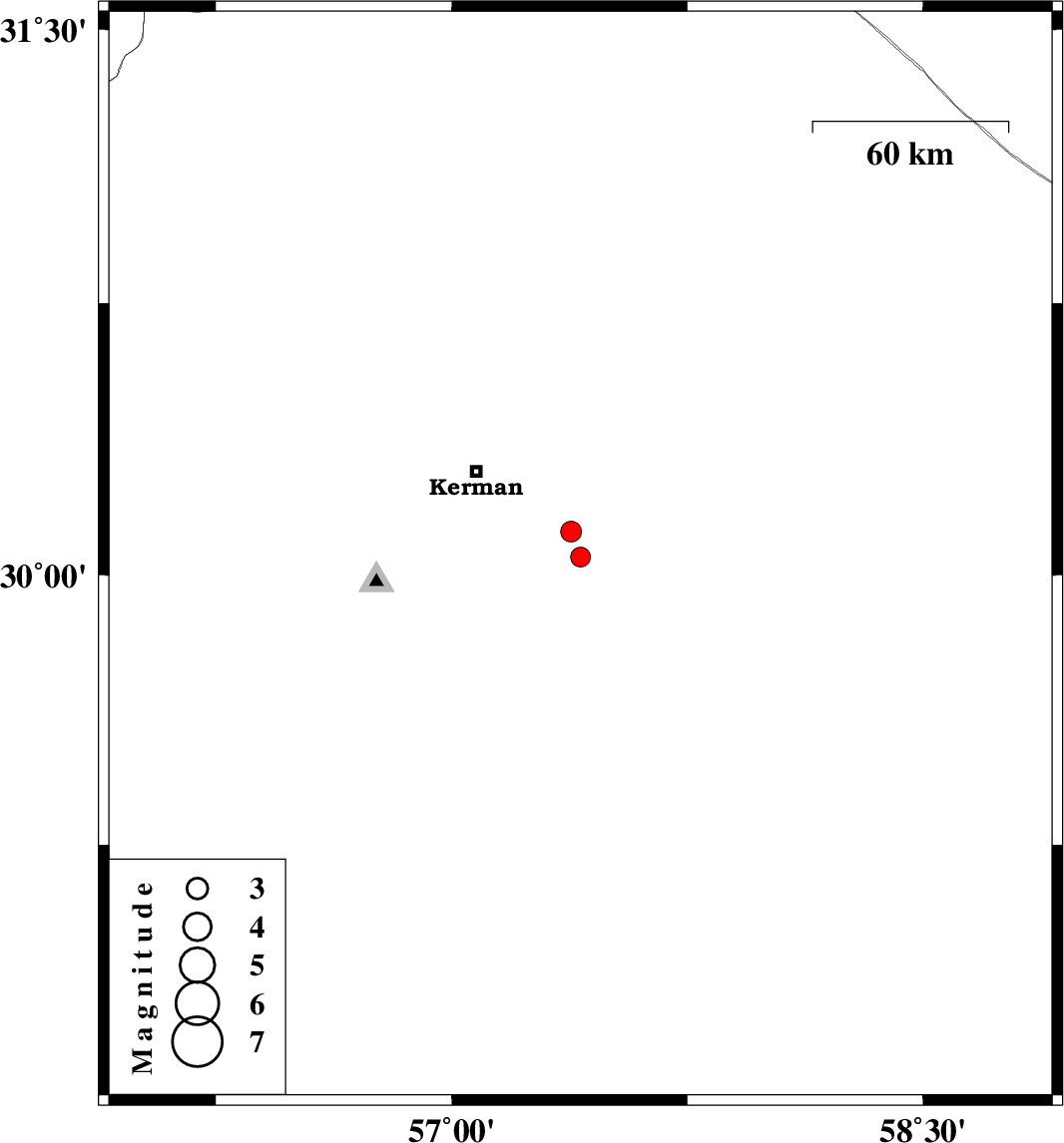 | 2011/05/11 | 20:14:48.5 | 00:44:48.5 | 30.12 | 57.38 | 6 | ML:3 | Kerman Province, 35 km South-East of Kerman |
