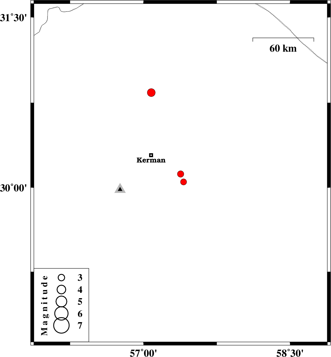 | 2011/05/11 | 20:14:48.5 | 00:44:48.5 | 30.12 | 57.38 | 6 | ML:3 | Kerman Province, 35 km South-East of Kerman | ||