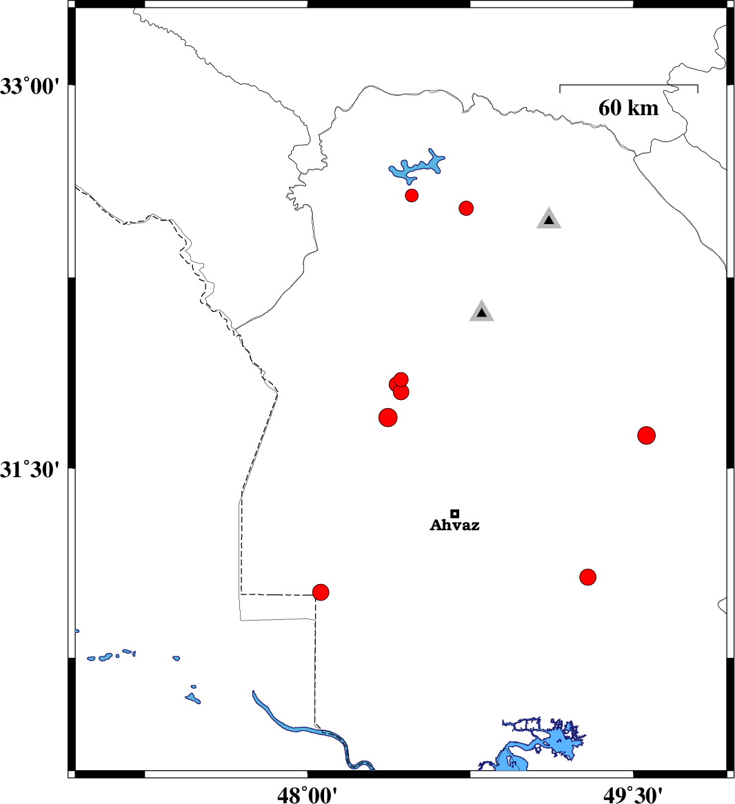 | 2011/05/14 | 09:43:40.4 | 14:13:40.4 | 32.52 | 48.73 | 14 | ML:3 | Khoozestan Province, 36 km East of Andimeshk | ||