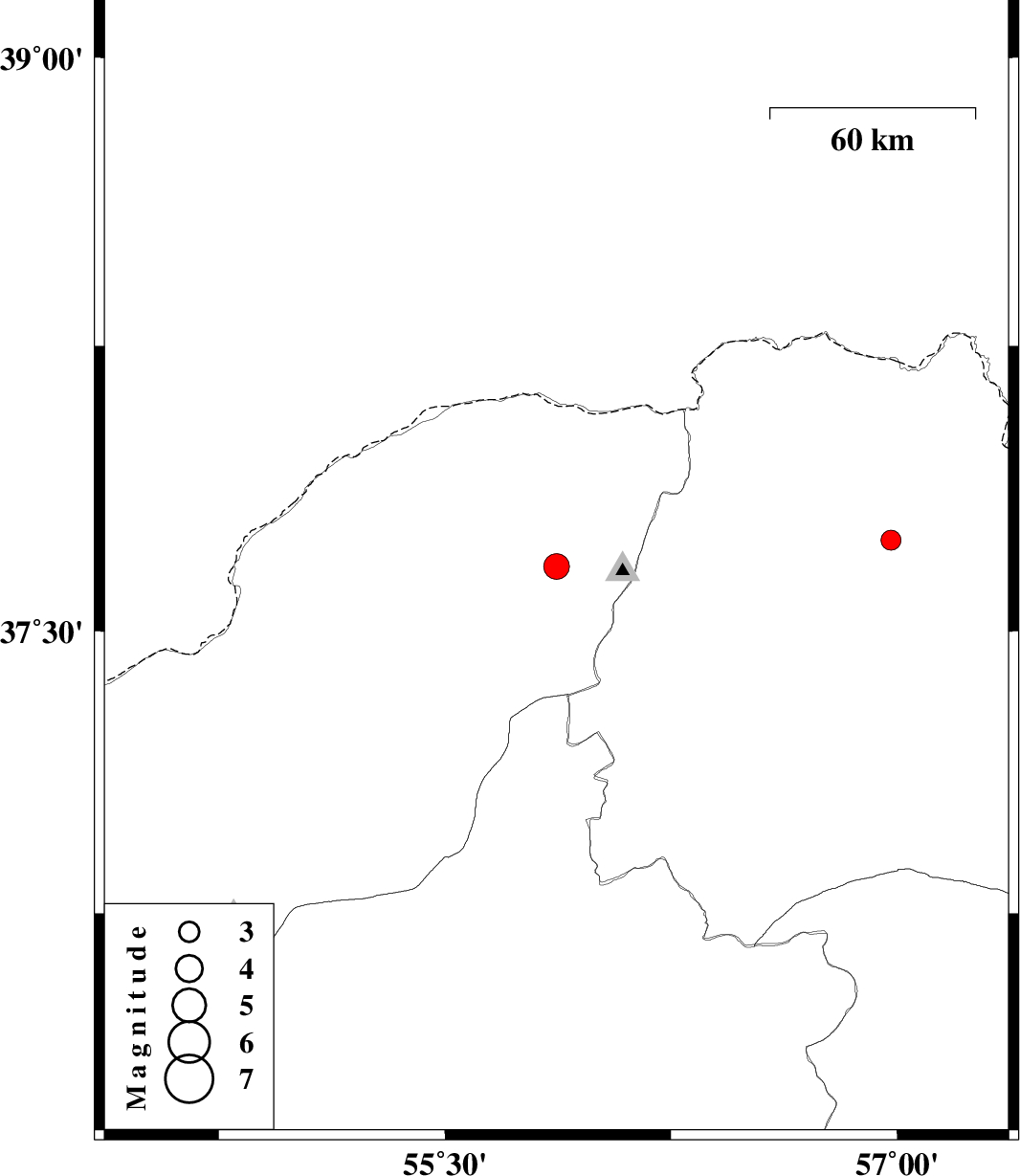 | 2011/05/15 | 14:49:36.7 | 19:19:36.7 | 37.67 | 55.87 | 14 | ML:3.8 | Golestan Province, 46 km North-East of Kalaleh | ||