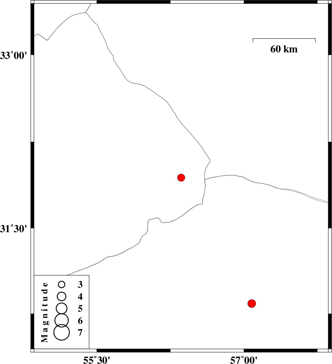| 2011/04/30 | 08:55:13.2 | 13:25:13.2 | 30.84 | 57.08 | 14 | ML:3.7 | Kerman Province, 49 km East of Zarand |