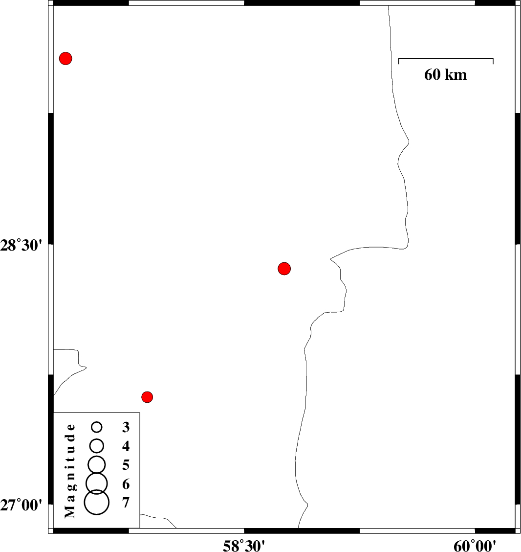 | 2011/05/14 | 11:39:27.5 | 16:09:27.5 | 29.56 | 57.34 | 11 | ML:3.7 | Kerman Province, 85 km South-East of Kerman |