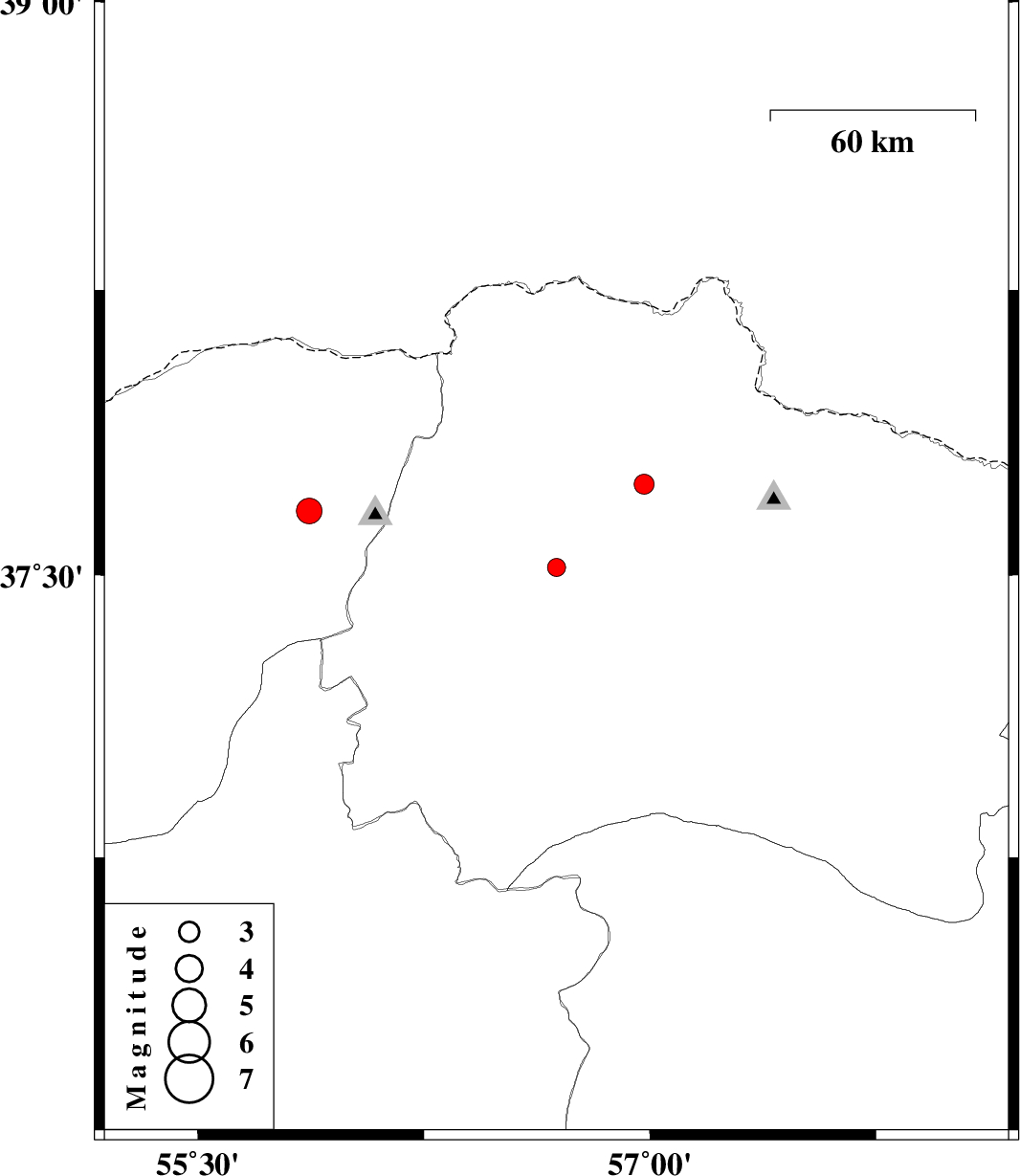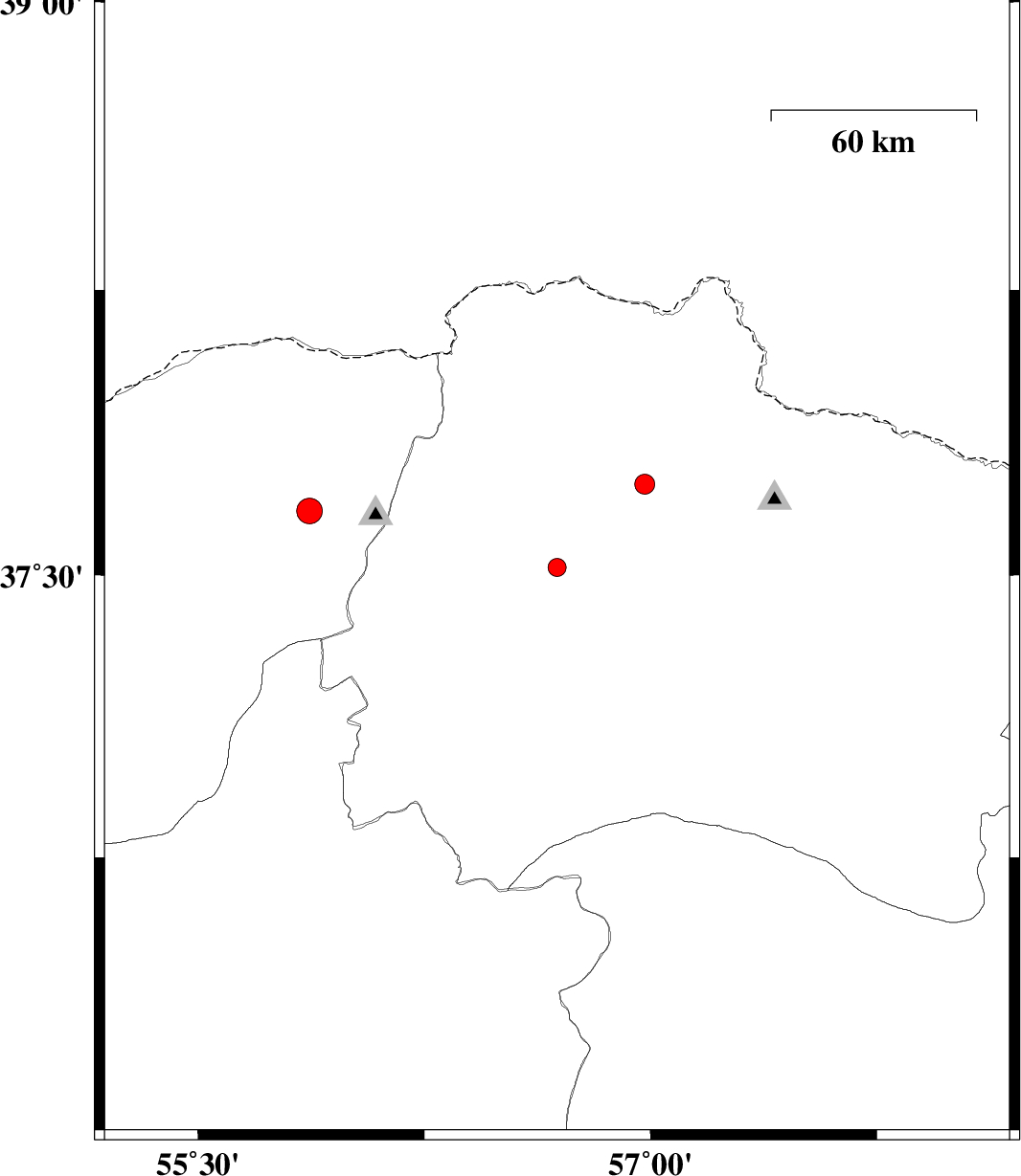 | 2011/05/15 | 14:49:36.7 | 19:19:36.7 | 37.67 | 55.87 | 14 | ML:3.8 | Golestan Province, 46 km North-East of Kalaleh | ||