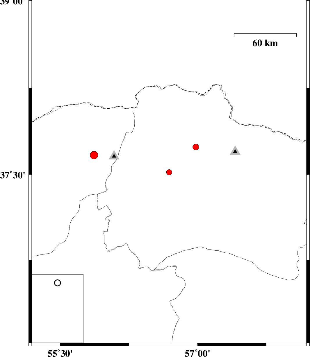 | 2011/05/15 | 14:49:36.7 | 19:19:36.7 | 37.67 | 55.87 | 14 | ML:3.8 | Golestan Province, 46 km North-East of Kalaleh | ||