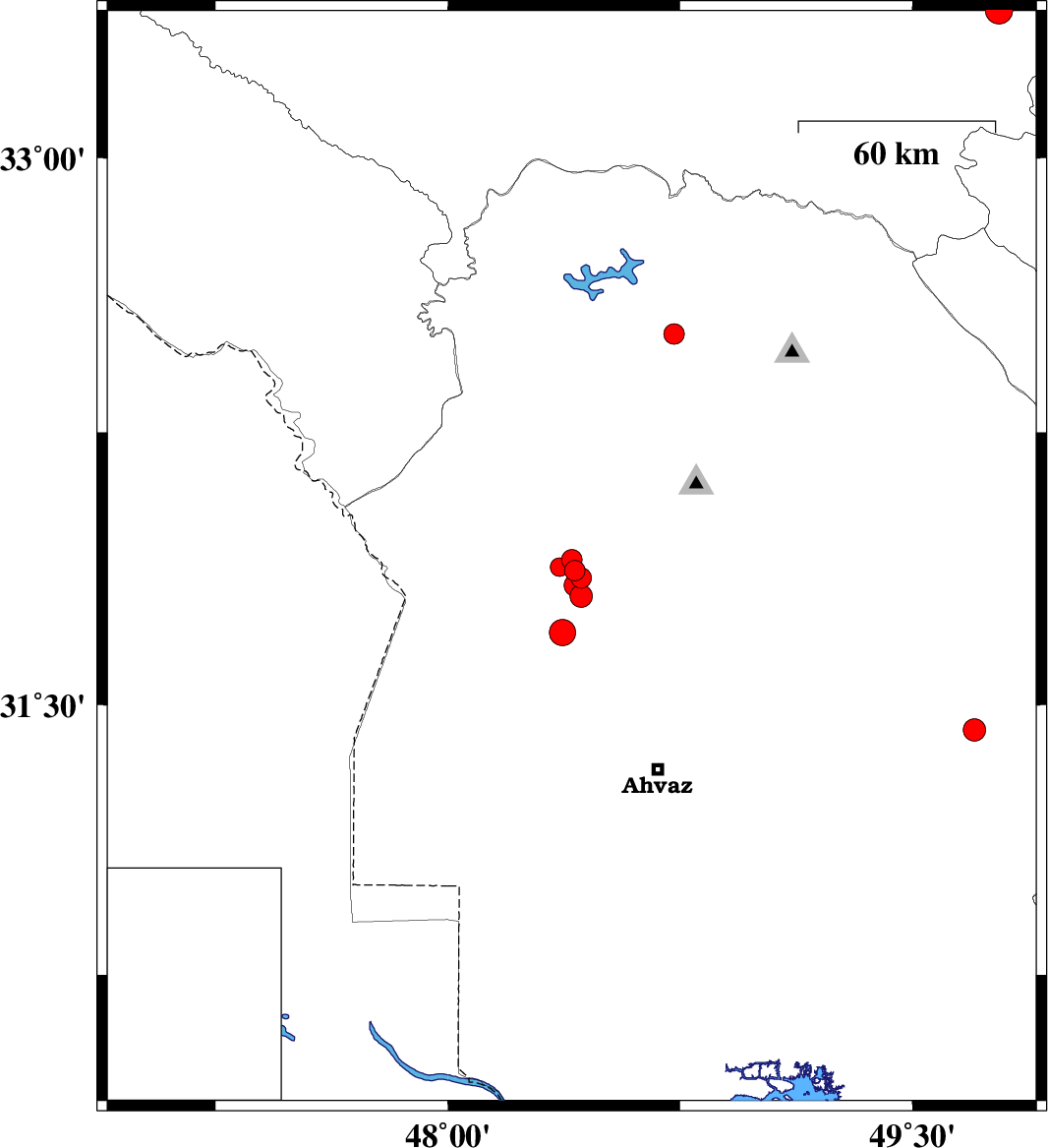 2011/05/17 | 02:56:42.7 | 07:26:42.7 | 31.9 | 48.4 | 15 | ML:2.9 | Khoozestan Province, 36 km South-East of Shush | ||