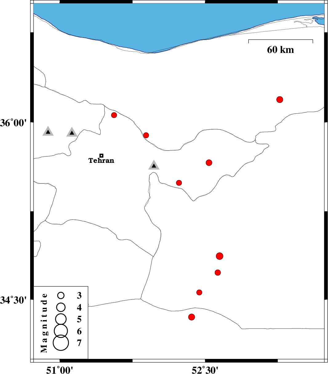 | 2011/05/08 | 04:02:58.5 | 08:32:58.5 | 34.87 | 52.65 | 15 | ML:3.2 | Semnan Province, 49 km South-East of Garmsar | ||
