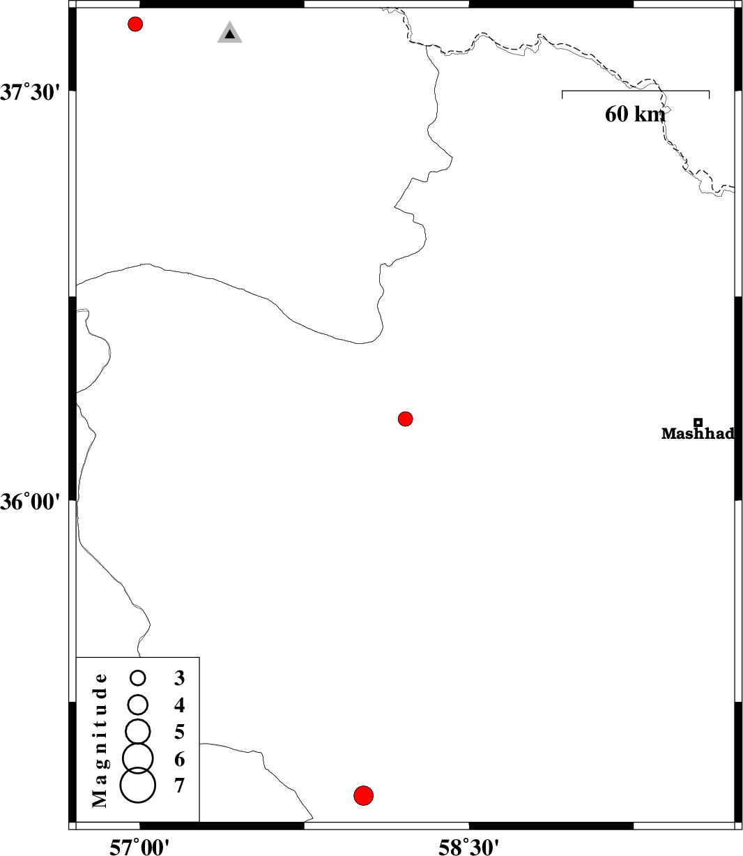 | 2011/04/23 | 08:00:50.6 | 12:30:50.6 | 34.9 | 58.02 | 41 | ML:4 | Khorasan(center) Province, 40 km South of Bardeskan |