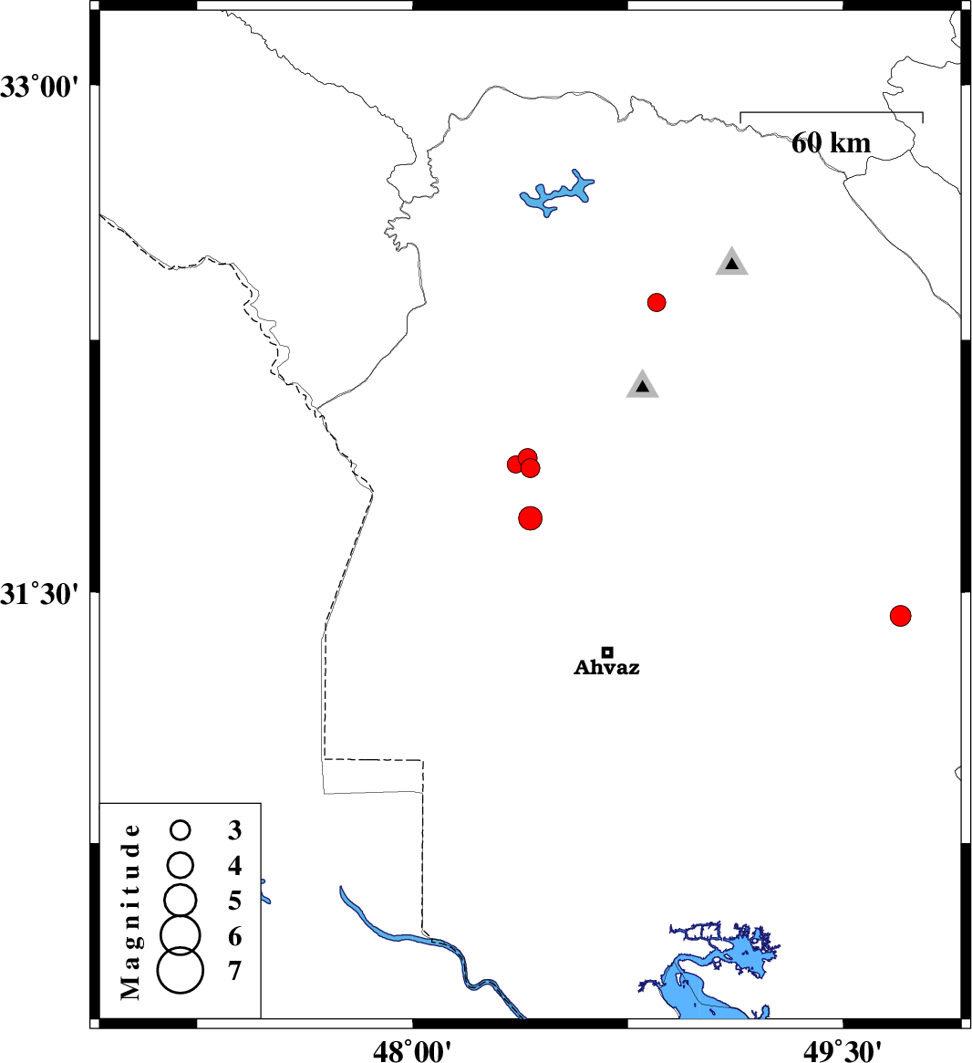 | 2011/05/17 | 10:11:06.9 | 14:41:06.9 | 31.87 | 48.41 | 14 | ML:3 | Khoozestan Province, 40 km South-East of Shush | ||